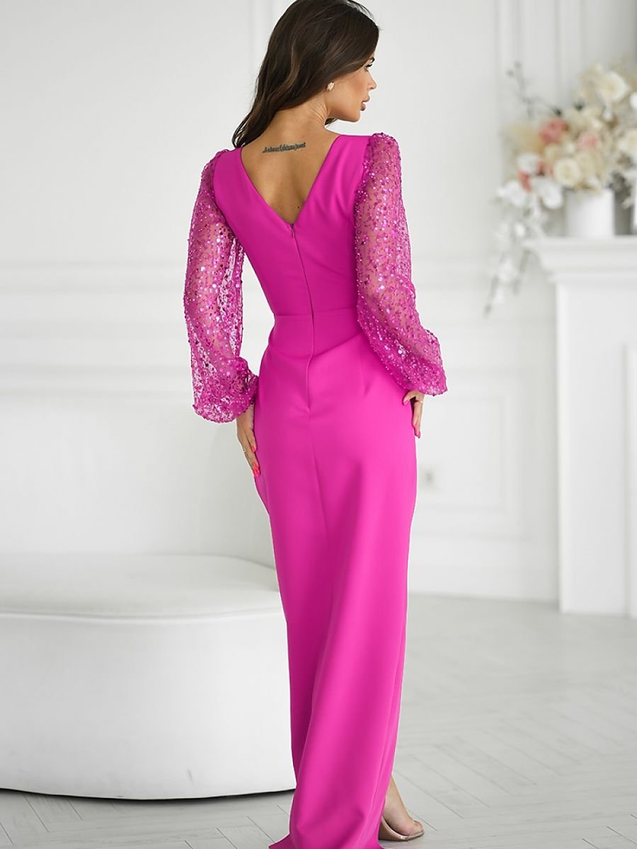 Zjawiskowa kreacja z dwoma cekinowymi rękawami. Dekolt delikatny w kształcie serka, lekko eksponuje biust. Dół sukienki przekładany, z efektownym rozcięciem na nodze. Uroku i szyku dodają cekinowe rękawy, które są idealnym dodatkiem  do kreacji. Sukienka zapinana na kryty zamek. Dostępna w prześlicznych kolorach.