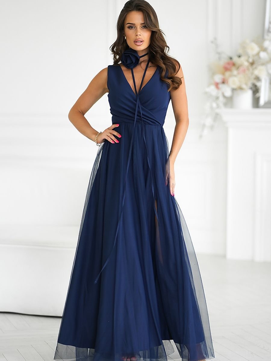 Piękna, długa sukienka, która zachwyca swoim niezwykłym krojem. Uszyta ze zwiewnej tkaniny, idealnie podkreśla sylwetkę. Góra sukienki posiada delikatny dekolt, a dwuwarstwowy dół z wycięciem na nodze dodaje kreacji powabności. Do sukienki dołączony jest pasek z różyczką, który można owinąć na wiele sposobów, zarówno na szyję, jak i na talię, co pozwala na indywidualne dopasowanie stylizacji.