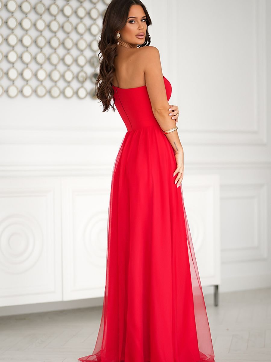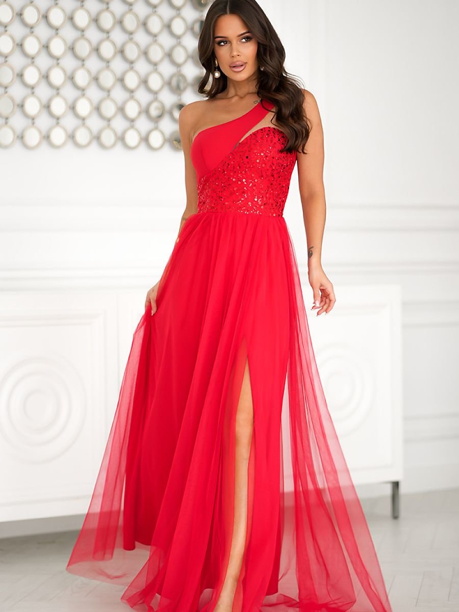 Elegancka sukienka z usztywnianą górą, krytym zamkiem i połyskującymi cekinami. Zwiewny dół z siatki z efektownym rozcięciem dodaje zmysłowości. Sukienka zapinana na kryty zamek. Idealna na wesela, bale i wyjątkowe okazje.