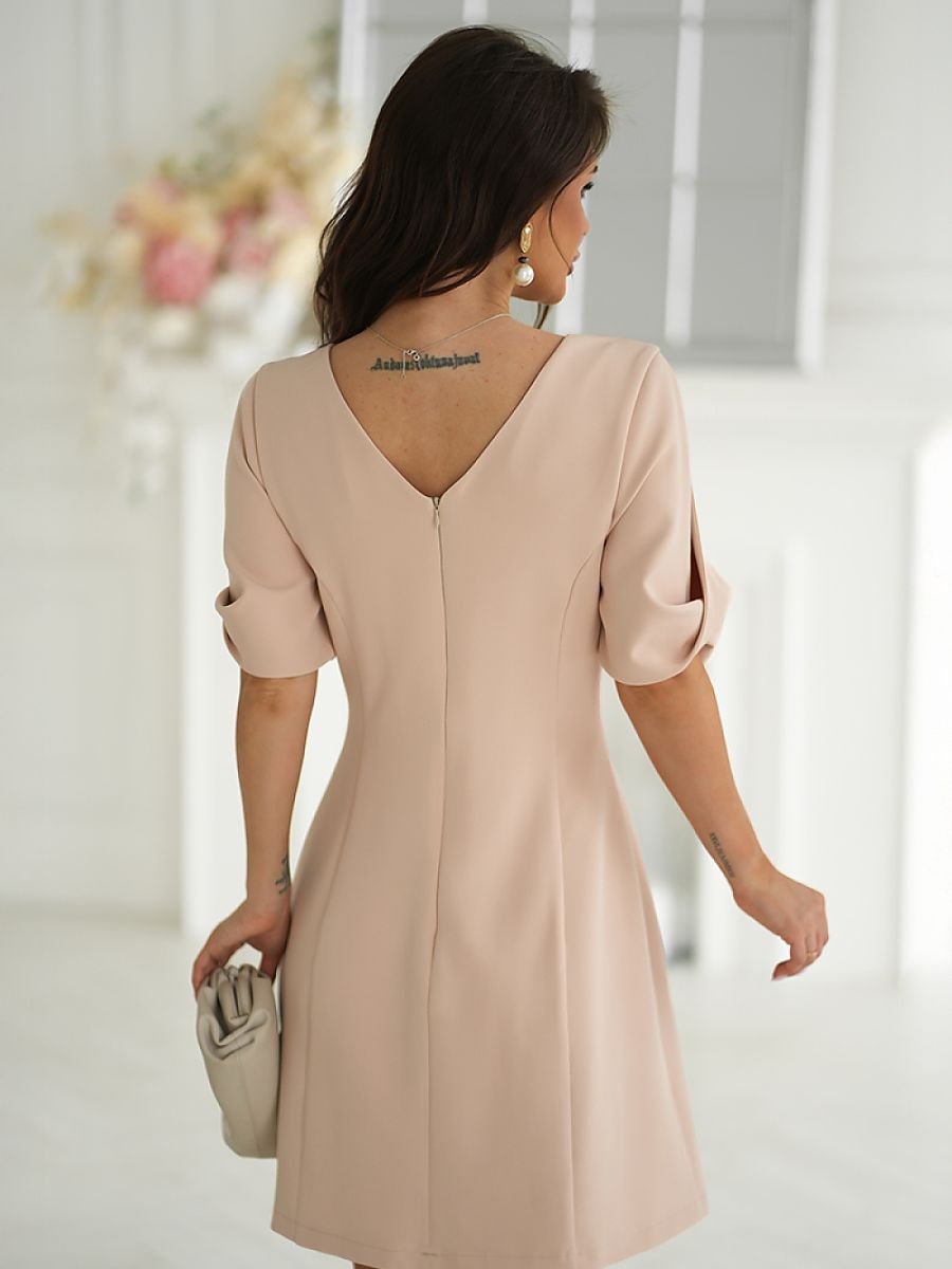 Stylowa sukienka w odcieniu pudrowego różu o kroju A-line który subtelnie podkreśla sylwetkę. Ozdobne, krótkie rękawy z wycięciami dodają lekkości i unikalnego charakteru. Podszycie zapewnia komfort noszenia. Idealna na każdą okazję! Wykonana z wysokiej jakości materiału, który pięknie układa się na sylwetce. Sukienka zapinana na kryty zamek.