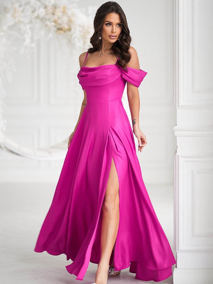 Dopasowana góra podkreśla talię, a długa, zwiewna spódnica optycznie wysmukla sylwetkę. Efektowne rozcięcie dodaje lekkości i swobody ruchu. Wykonana z miękkiego, połyskującego materiału, który delikatnie mieni się przy każdym kroku. Sukienka zapinana na kryty zamek, posiada podszewkę. Idealna na wyjątkowe okazje, łączy klasę i komfort.