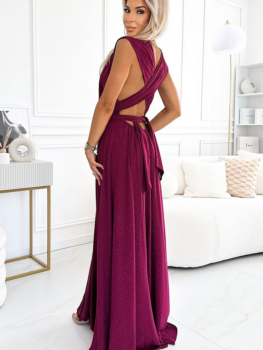 Elegancka maxi długa suknia, którą można wiązać na wiele sposobów. Uszyta z bordowego elastycznego materiału z brokatem. Produkcja polska. Marka Numoco.