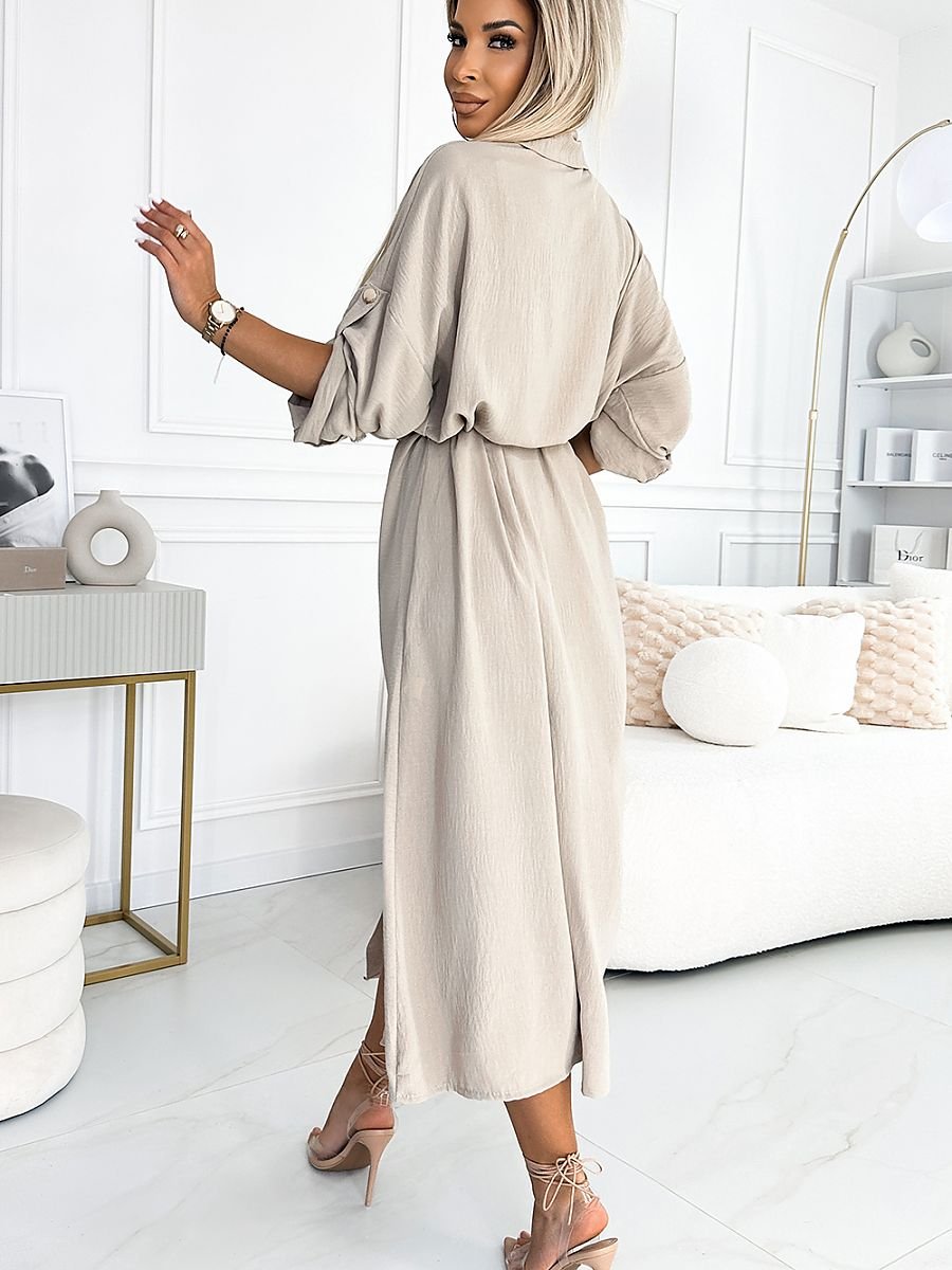 Beżowa szmizjerka ze złotymi guzikami i wiązaniem w pasie. Marka numoco basic. Produkcja europejska.