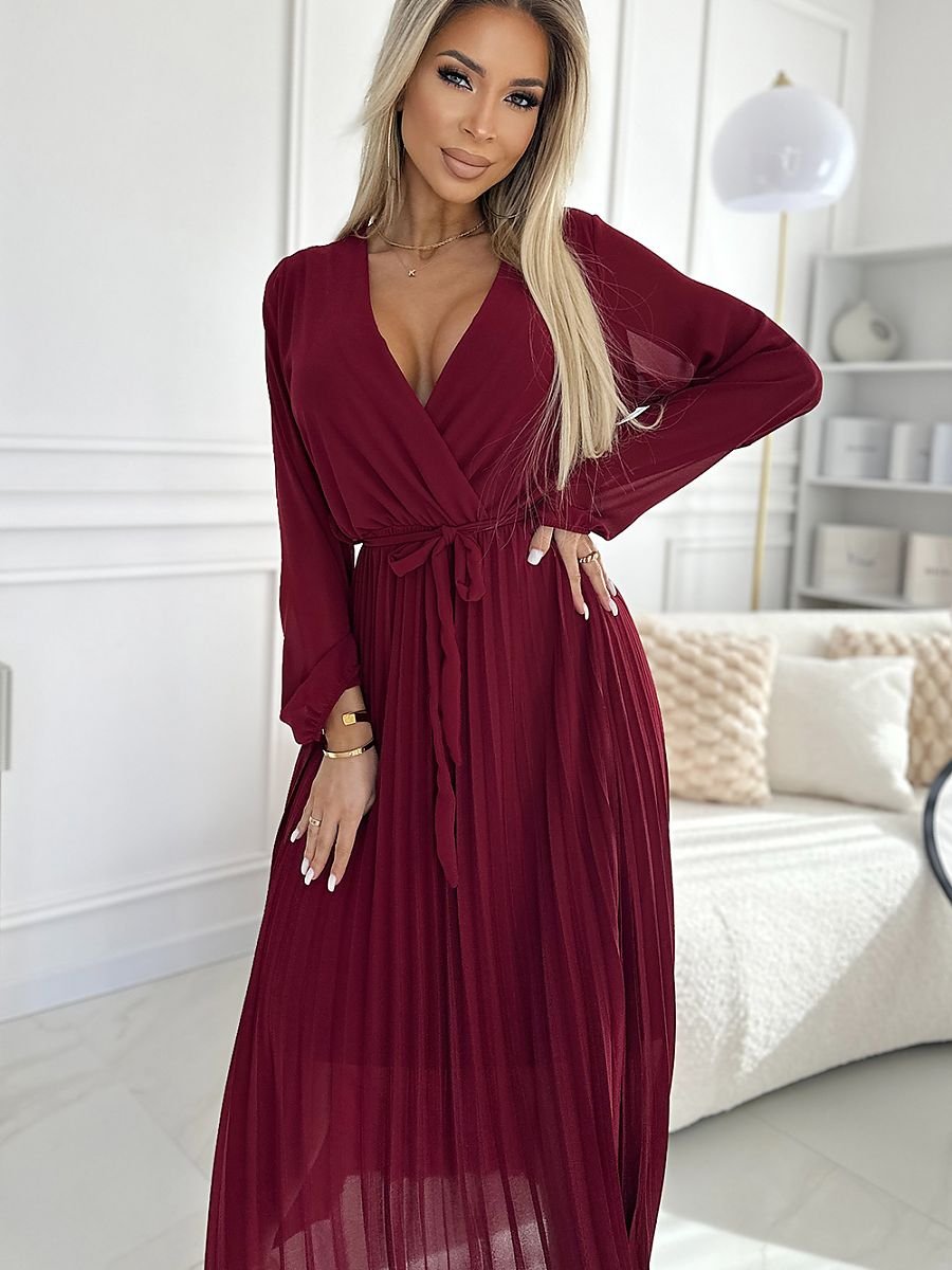 Plisowana szyfonowa sukienka z kopertowym dekoltem, długim rękawkiem i wiązanym paskiem. Uszyta ze zwiewnego materiału w kolorze bordowym. Idealna sukienka na każdą okazję. Marka numoco basic. Produkcja europejska.
