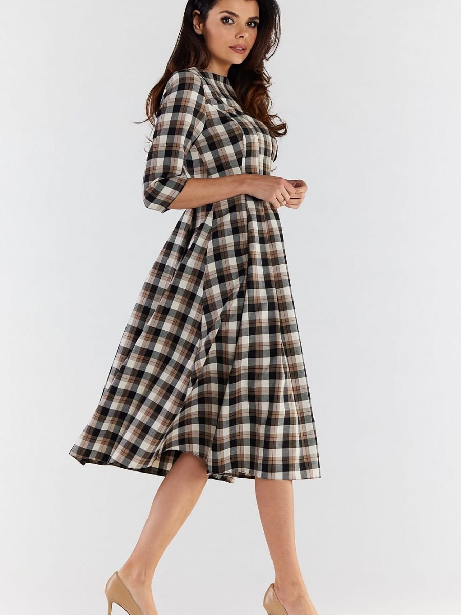 Rozkloszowana sukienka midi z rękawem 3/4, zapinana na kryty zamek. Uszyta z tkaniny w modną kratę. Fason sukienki optycznie modeluje sylwetkę i podkreśla kobiecość. Idealna zarówno na rodzinne uroczystości, jak i na służbowe spotkania w biurze. Zaprojektowano i uszyto w Polsce.