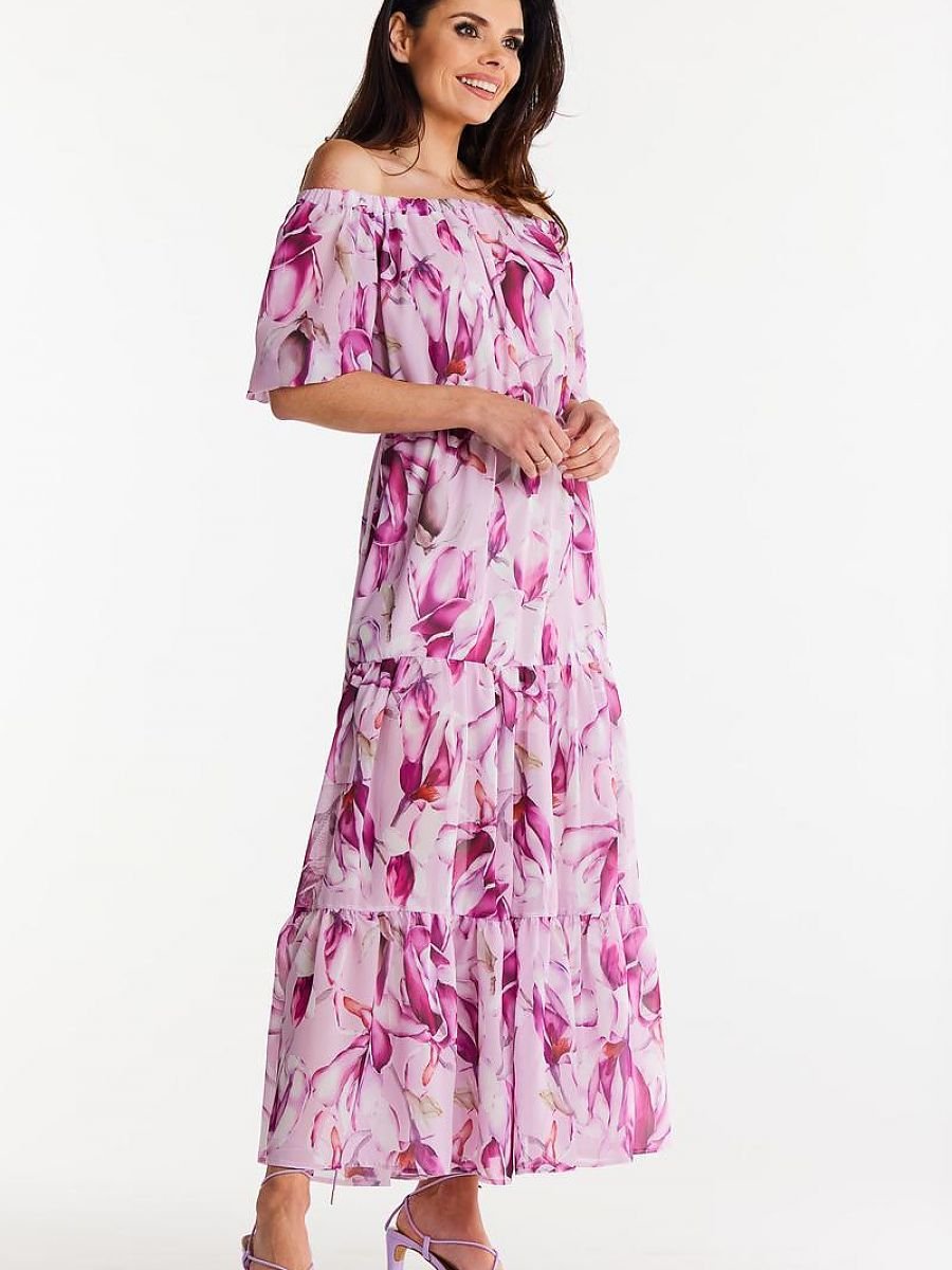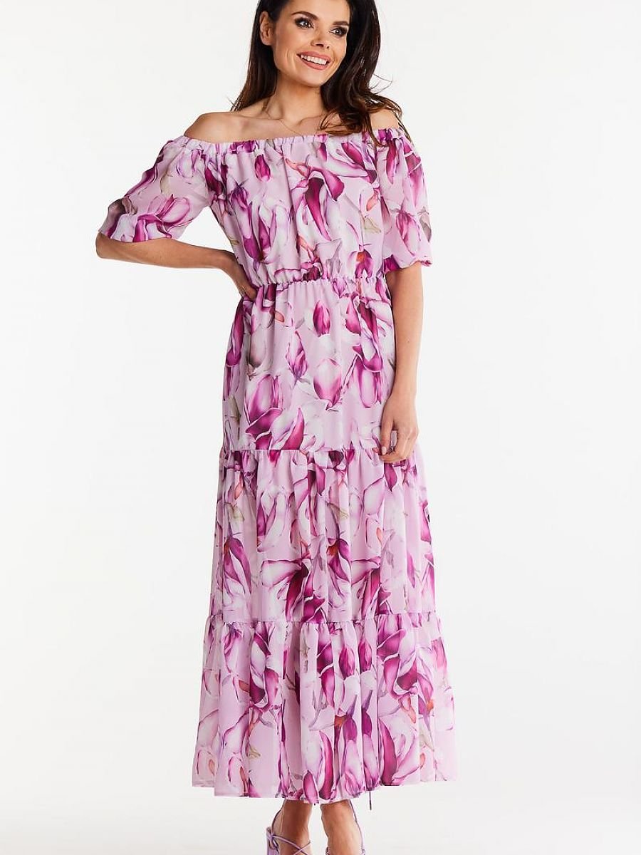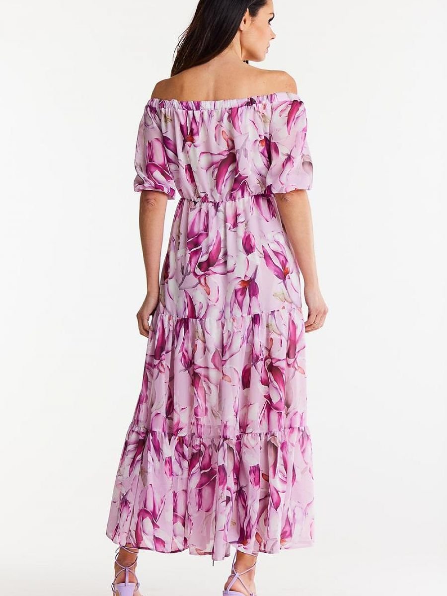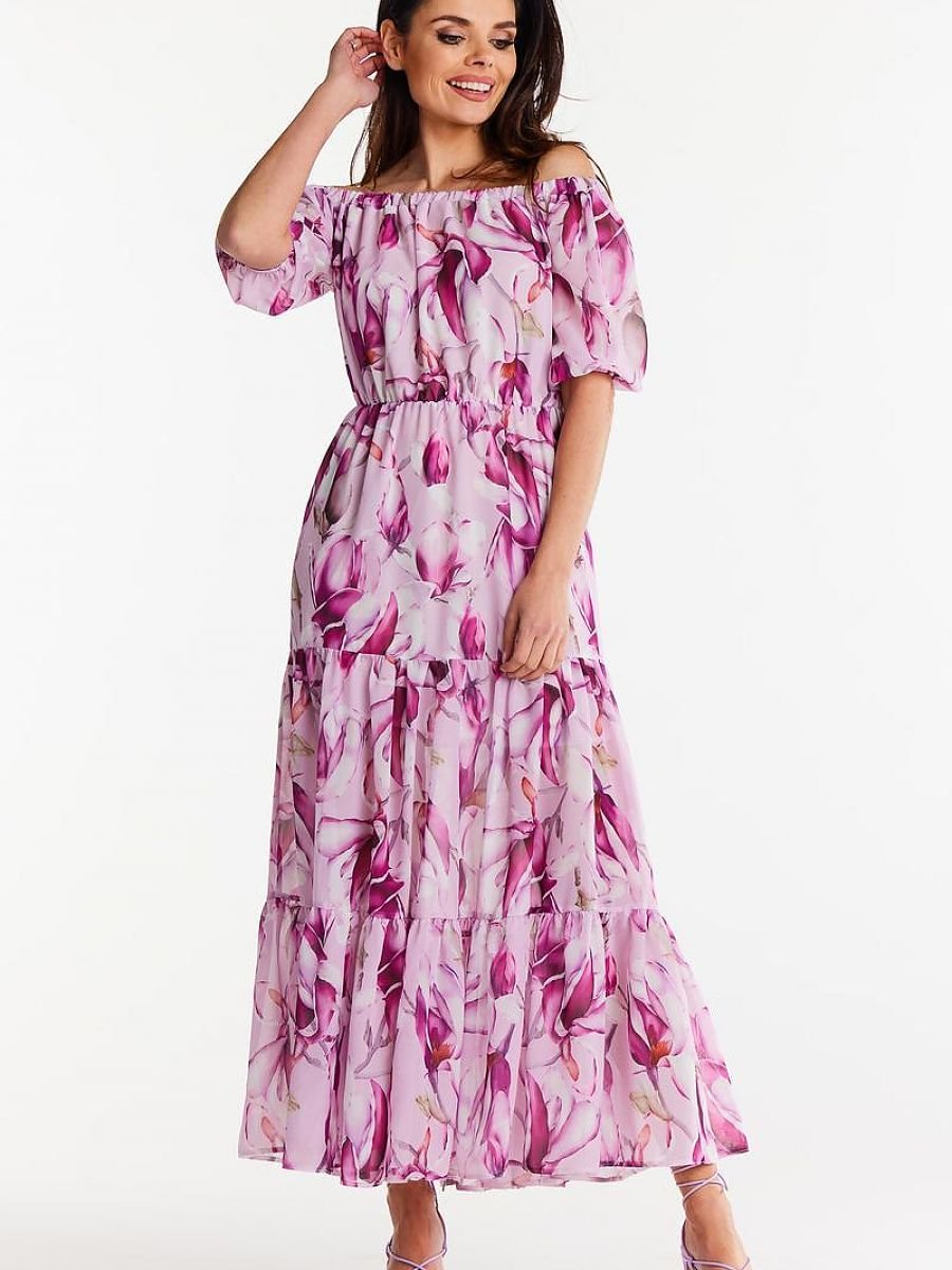 Długa sukienka z szyfonu na elastycznej podszewce z dwoma falbanami na dole i gumką w pasie. Rękawki 3/4 z gumką na dole. Przy dekolcie gumka podtrzymująca.