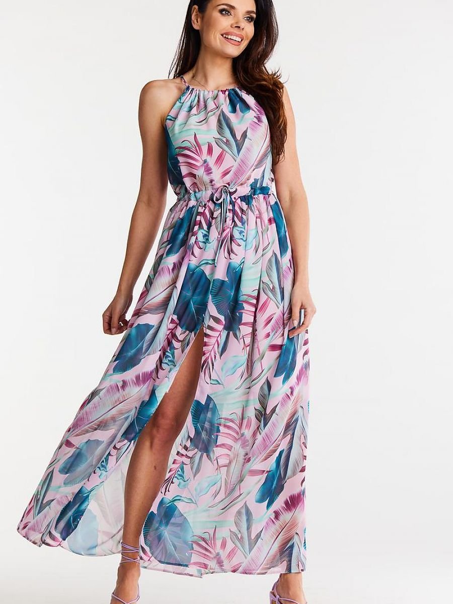 Długa sukienka z szyfonu na elastycznej podszewce i cienkich ramiączkach wiązanych z tyłu. Sukienka na środku dołu ma rozcięcie, a w pasie regulowana sznurkiem. Pierz w 30 stopniach w delikatnym detergencie, nie wybielaj, nie susz w suszarce. Produkt wyprodukowany w Polsce.