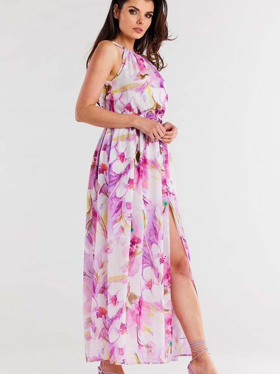 Długa sukienka z szyfonu na elastycznej podszewce i cienkich ramiączkach wiązanych z tyłu. Sukienka na środku dołu ma rozcięcie, a w pasie regulowana sznurkiem. Produkt wyprodukowany w Polsce.