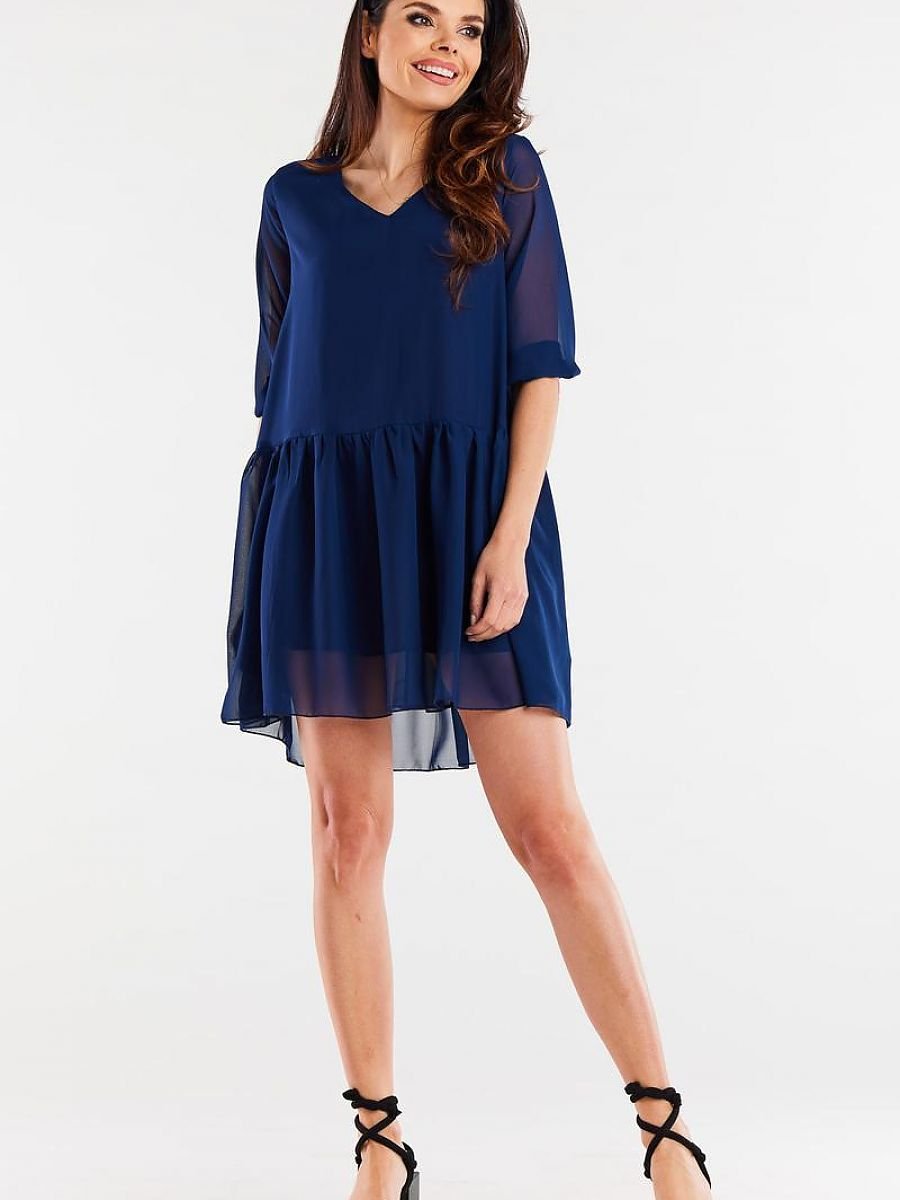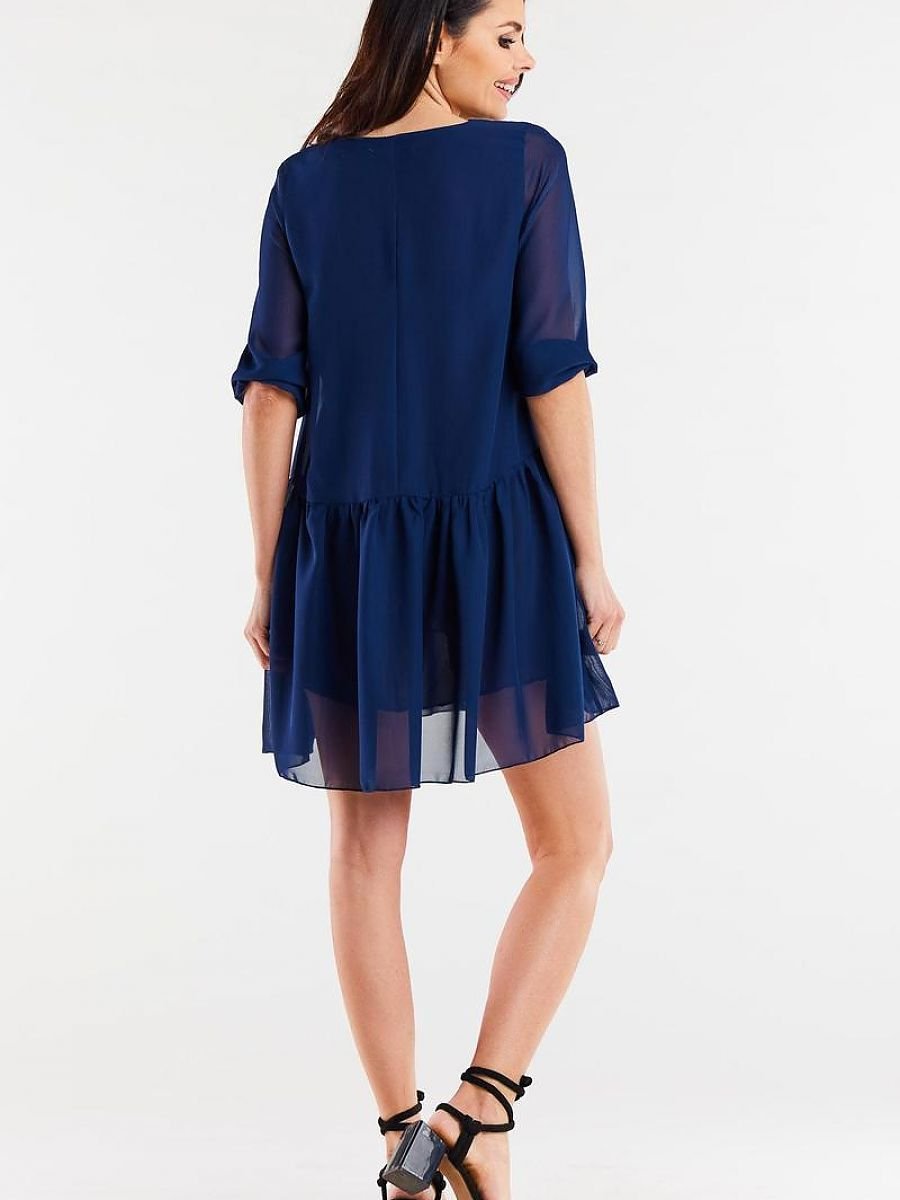Luźna sukienka z szyfonu na elastycznej podszewce, z ozdobną falbaną na dole oraz rękawkami 3/4 z gumką.
