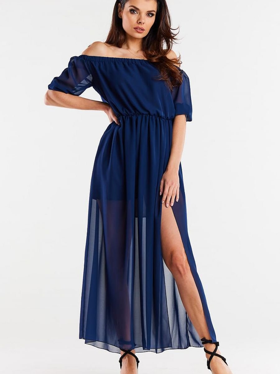Długa sukienka z szyfonu na elastycznej podszewce z rozcięciami na dole po lewej stronie. Sukienka w dekolcie i pasie z gumką w celu dopasowania do sylwetki. Rękawki 3/4 również z gumką.