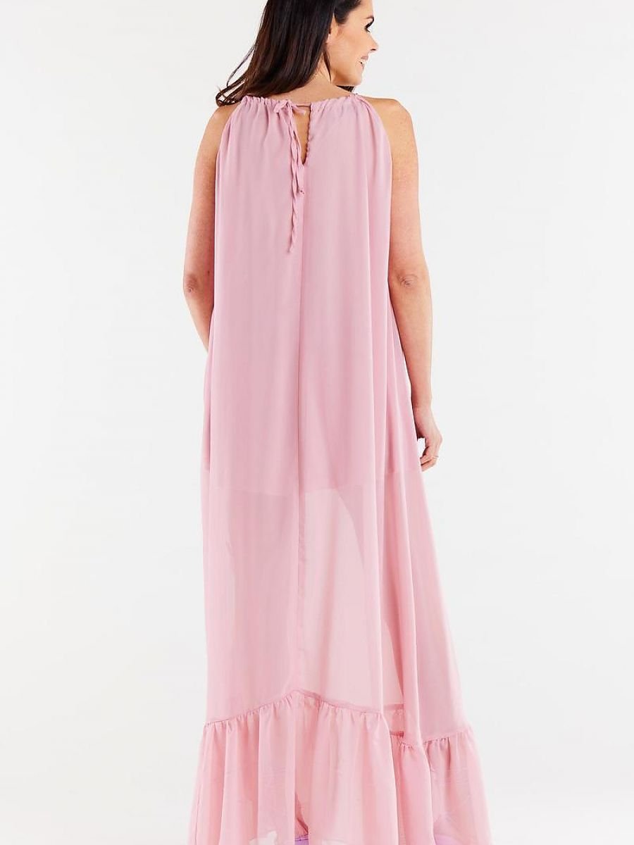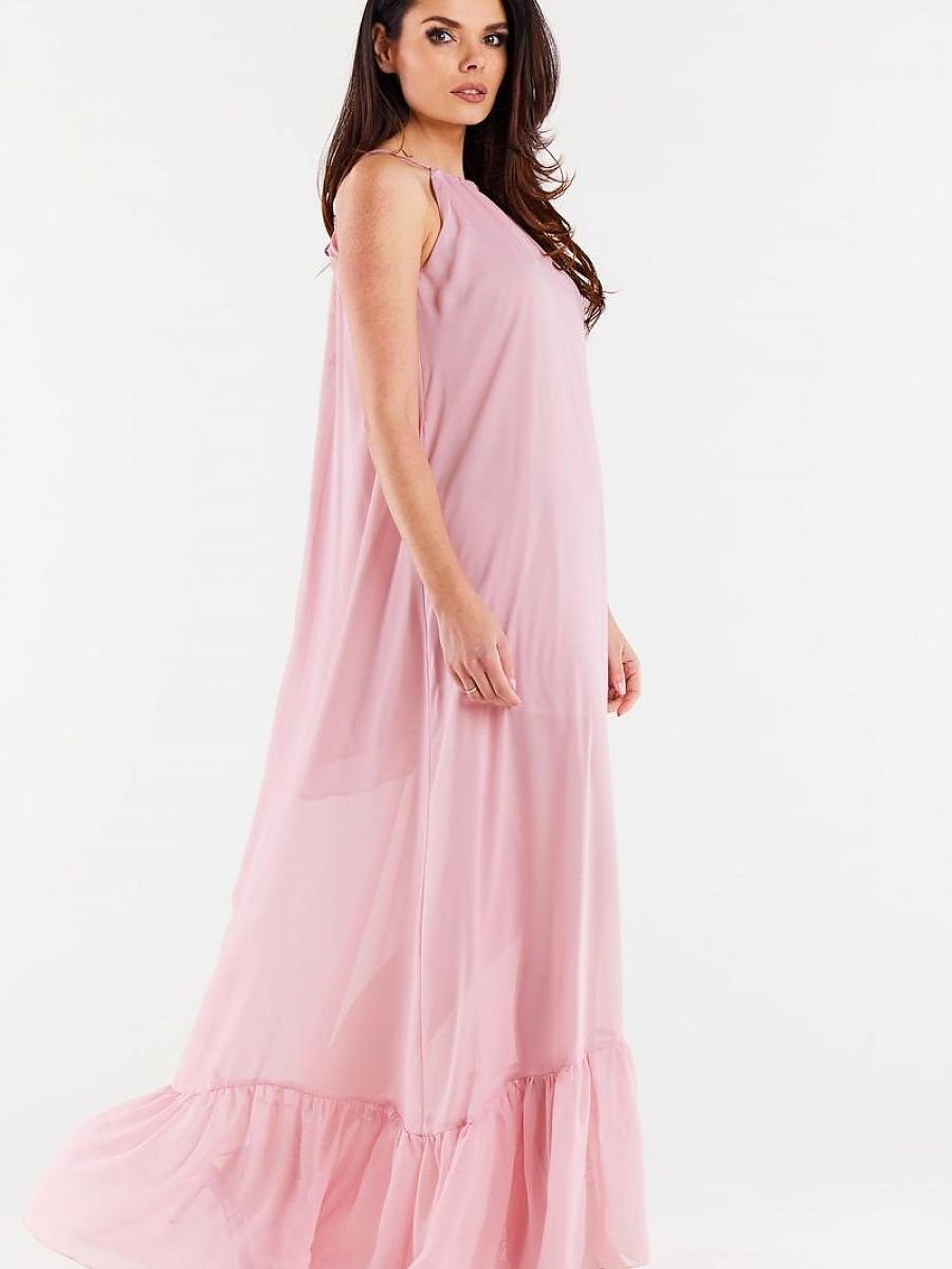 Długa, luźna sukienka z szyfonu na elastycznej podszewce, z ozdobną falbaną na dole i cienkimi ramiączkami wiązanymi na środku tyłu.