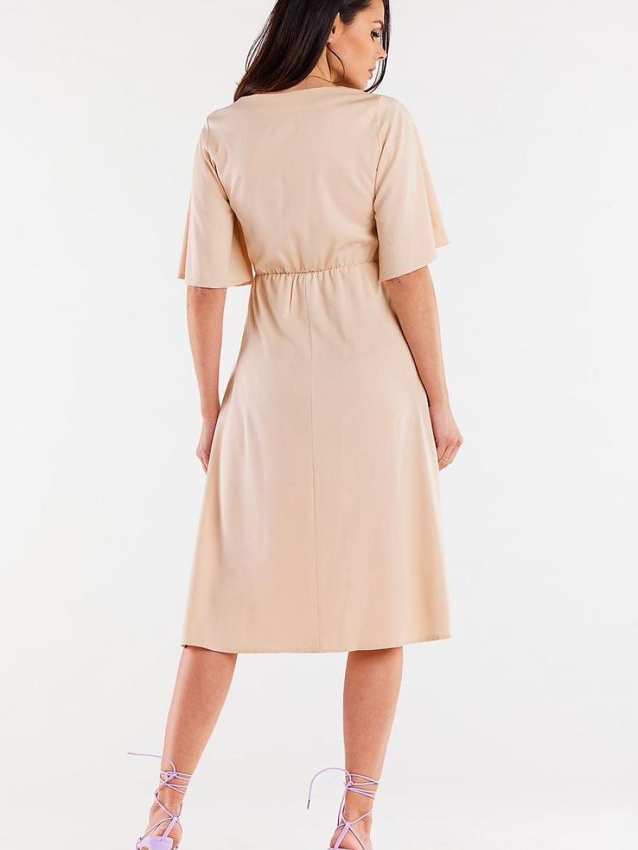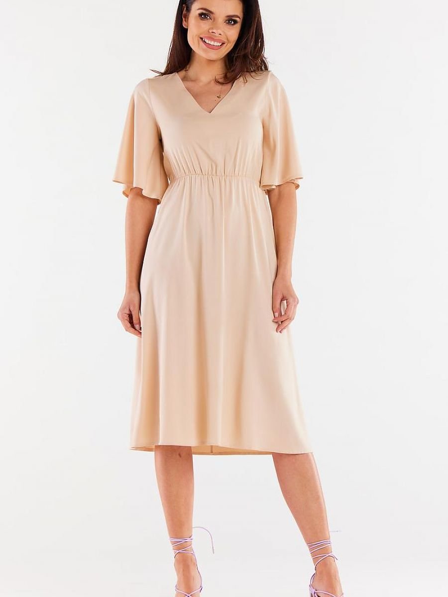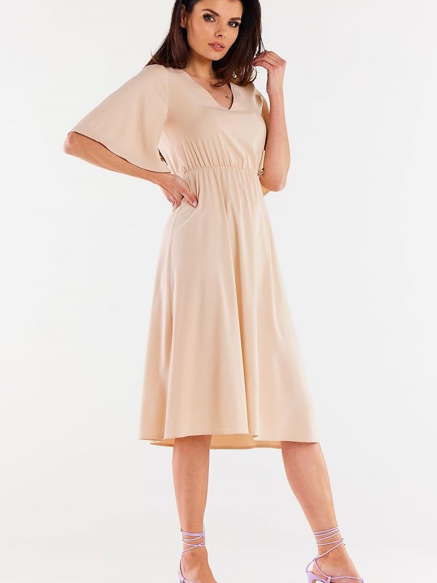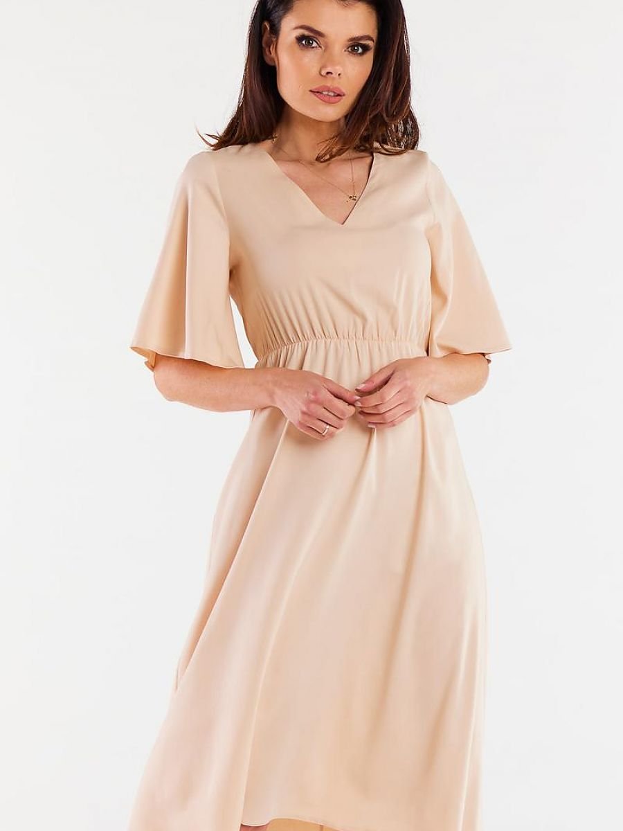 Sukienka z wiskozy, lekko rozkloszowana na dole. Gumka w pasie w celu dopasowania do sylwetki i szerokimi rękawami.
