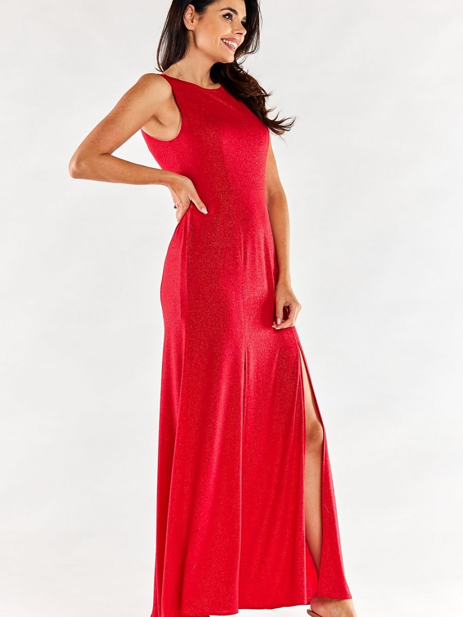 Długa, elegancka suknia, dopasowana w biuście, talii i biodrach. Na przodzie znajdują się dwa rozcięcia, dzięki którym można wyeksponować nogi. Sukienka zapinana z tyłu na zamek kryty. Uszyta na elastycznej podszewce. Sukienka wyprodukowana w Polsce.