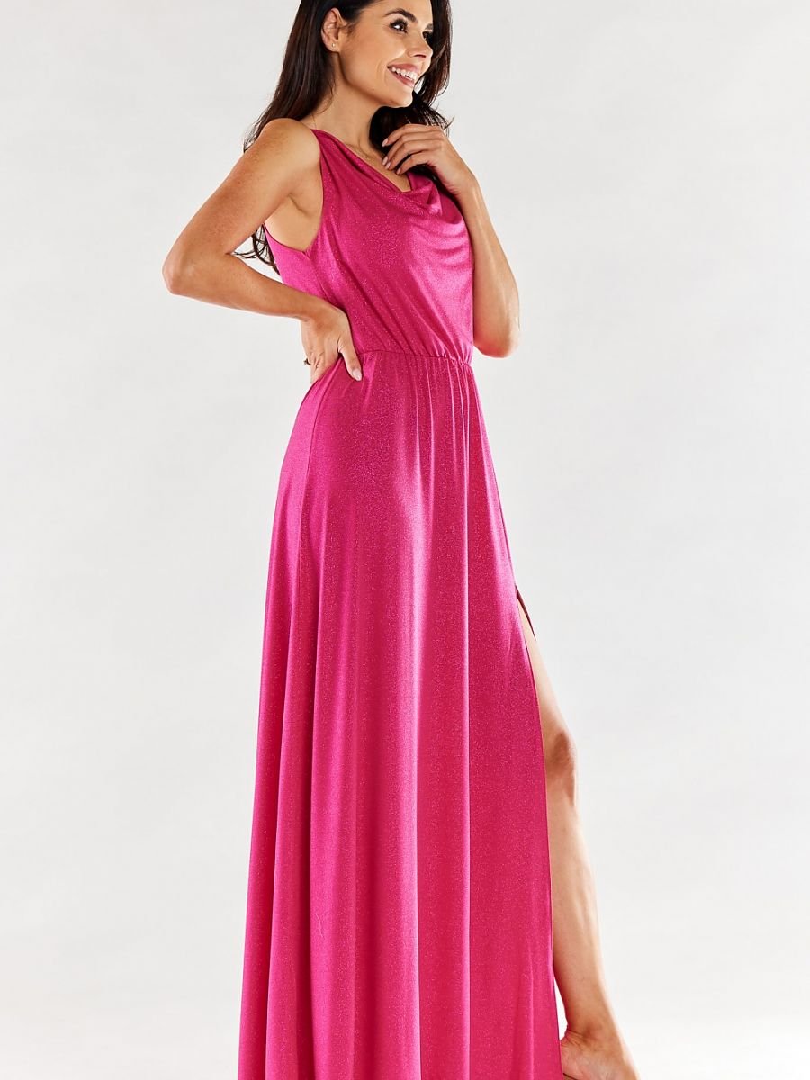 Elegancka, długa suknia z marszczonym dekoltem. Na lewej stronie dołu sukienki rozcięcie. W pasie marszczenie gumką w celu dopasowania do sylwetki. Sukienka uszyta na elastycznej podszewce. Sukienka wyprodukowana w Polsce.