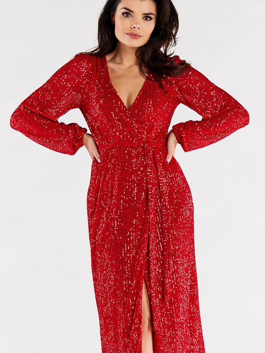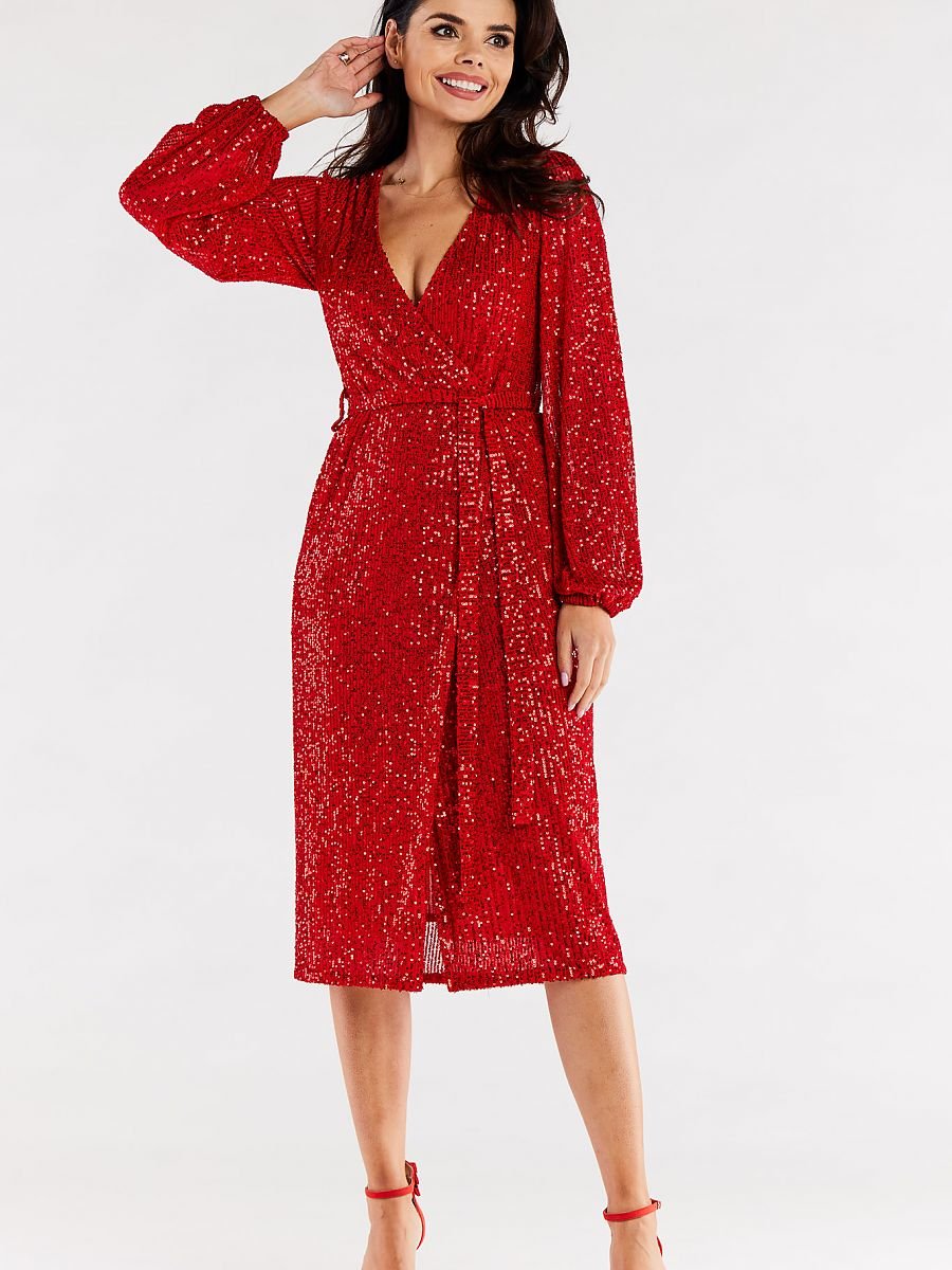 Sukienka kopertowa z wiązaniami na bokach i dodatkowym paskiem. Delikatnie dopasowana, z szerszym rękawem, który jest marszczony gumką przy nadgarstku. Sukienka uszyta na elastycznej podszewce. Sukienka wyprodukowana w Polsce.