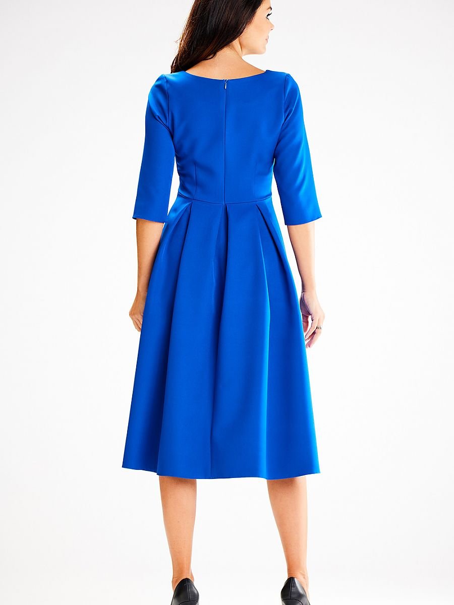 Elegancka sukienka z rozkloszowanym dołem i dopasowaną górą. Sukienka z pięknym i niepowtarzalnym dekoltem który podkreśla kobiece kształty. Jest zapinana z tyłu na zamek kryty.