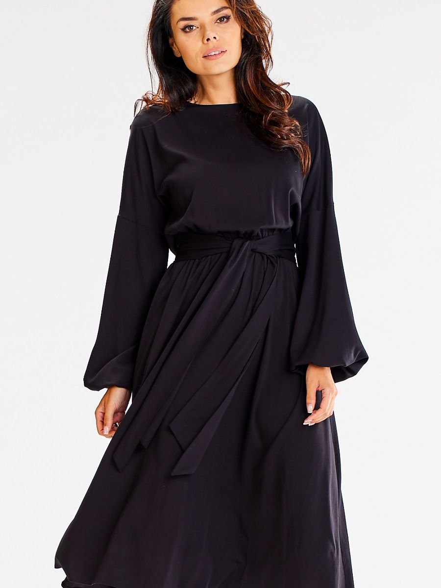 Luźna sukienka z rozkloszowanym dołem i długimi rękawami. W pasie dopasowana gumką i przewiązana szeroką szarfą.