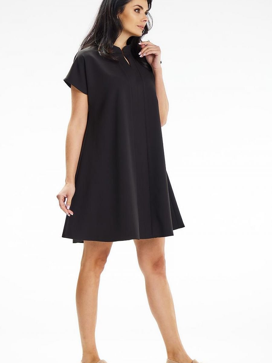 Trapezowa sukienka mini z krótkim rękawem i przeszytym przodem. Model posiada stójkę oraz rozcięcie na dekolcie. Idealna propozycja na randkę, wyjście na miasto jak i codziennych stylizacji.