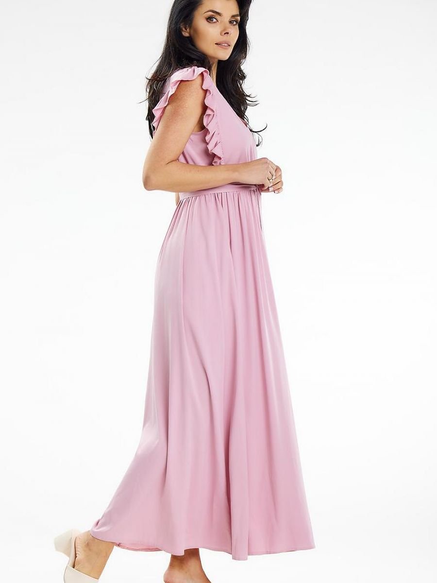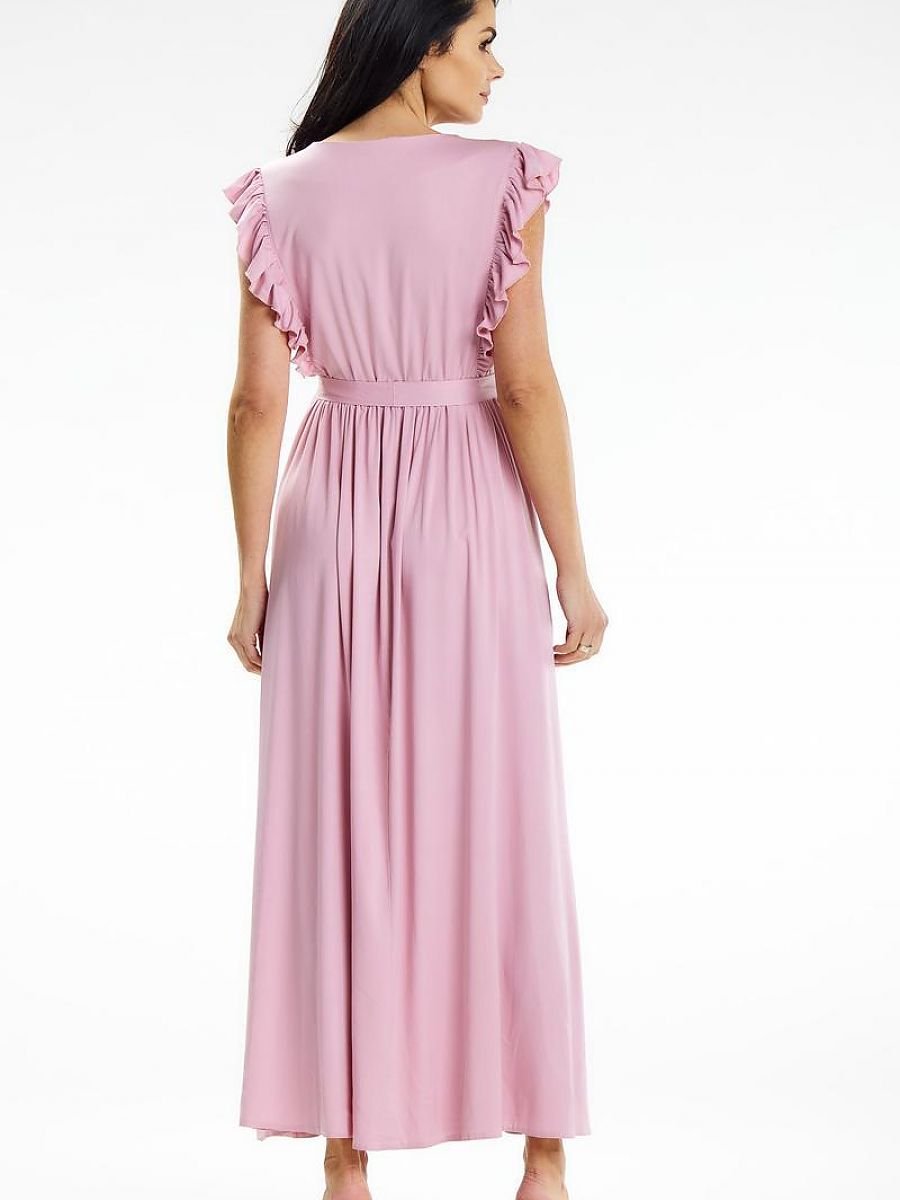 Sukienka maxi z kopertowym dekoltem i gumką w pasie. Posiada falbanki przy ramionach oraz pasek do przewiązania w talii. To najlepszy wybór na lato. Można ubrać ją na spacer po plaży, wyjście na randkę czy spotkanie ze znajomymi na mieście.