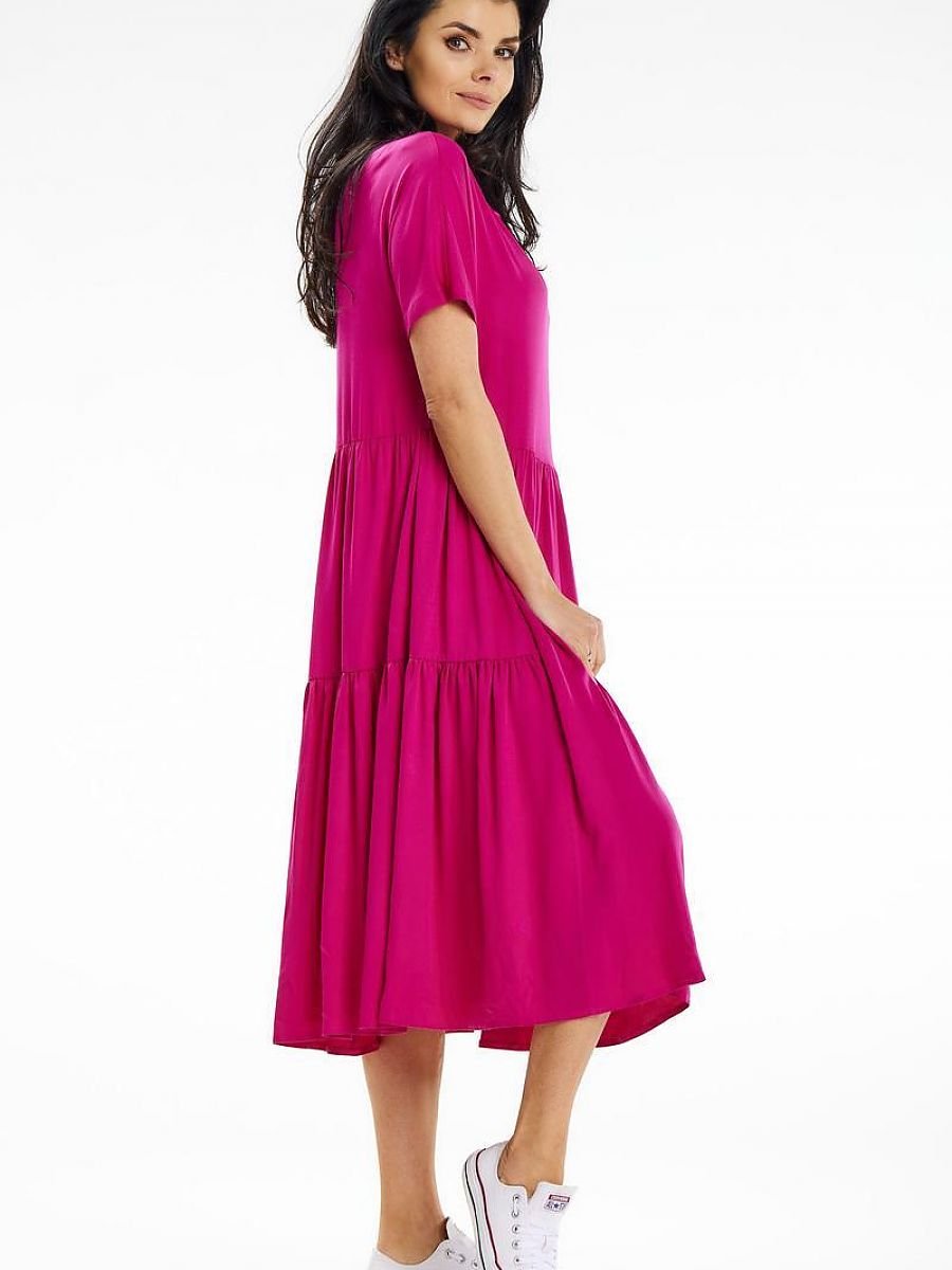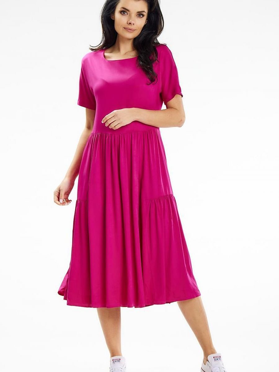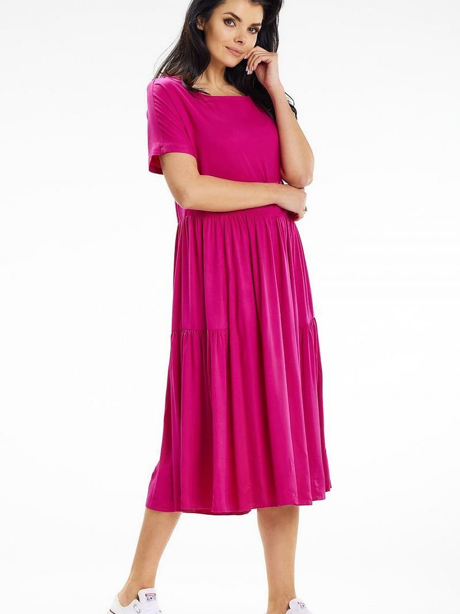 Luźna sukienka midi z krótkim rękawem i dekoltem w łódkę. Falbanki dodają jej lekkości i delikatności. Jest to propozycja na lato. Dzięki przyjemnemu materiałowi oraz niekrępującym ruchów fasonowi sprawdzi się nie tylko na spotkanie z przyjaciółmi, ale również na dłuższy spacer.