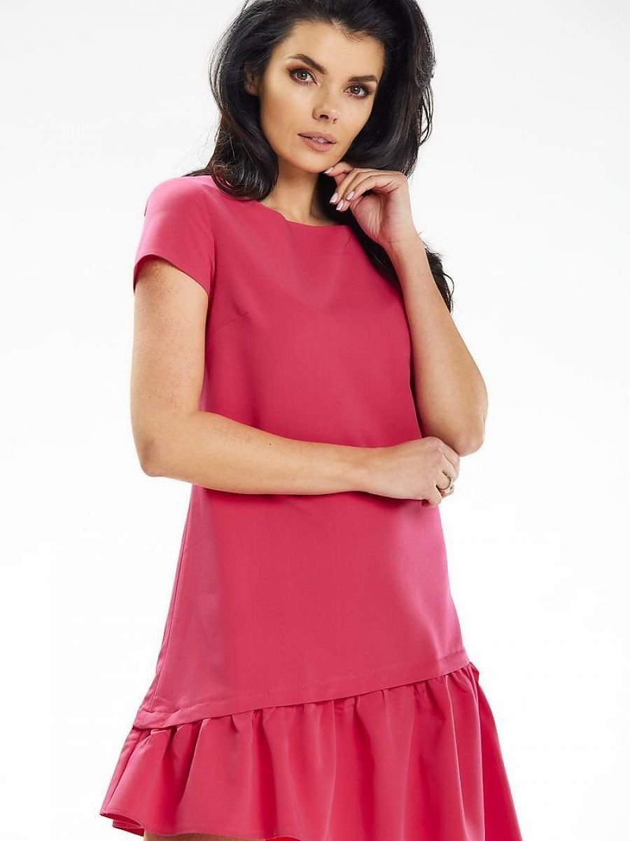 Sukienka trapezowa o długości mini z krótkim rękawkiem. Model ten wyróżnia asymetryczna falbanka na dole. Sukienka zapinana na zamek kryty z boku. Propozycja idealna na letnie wyjścia ze znajomymi oraz na imprezy rodzinne.