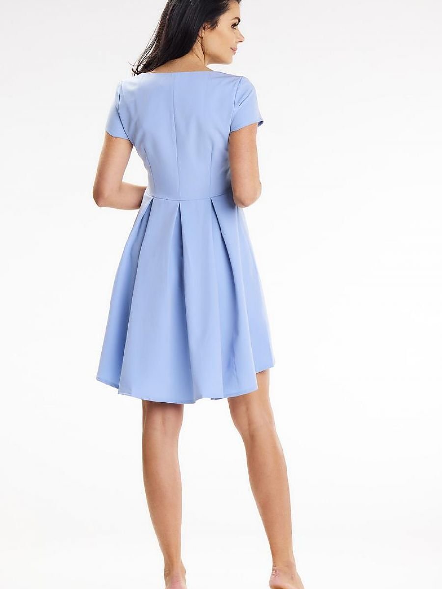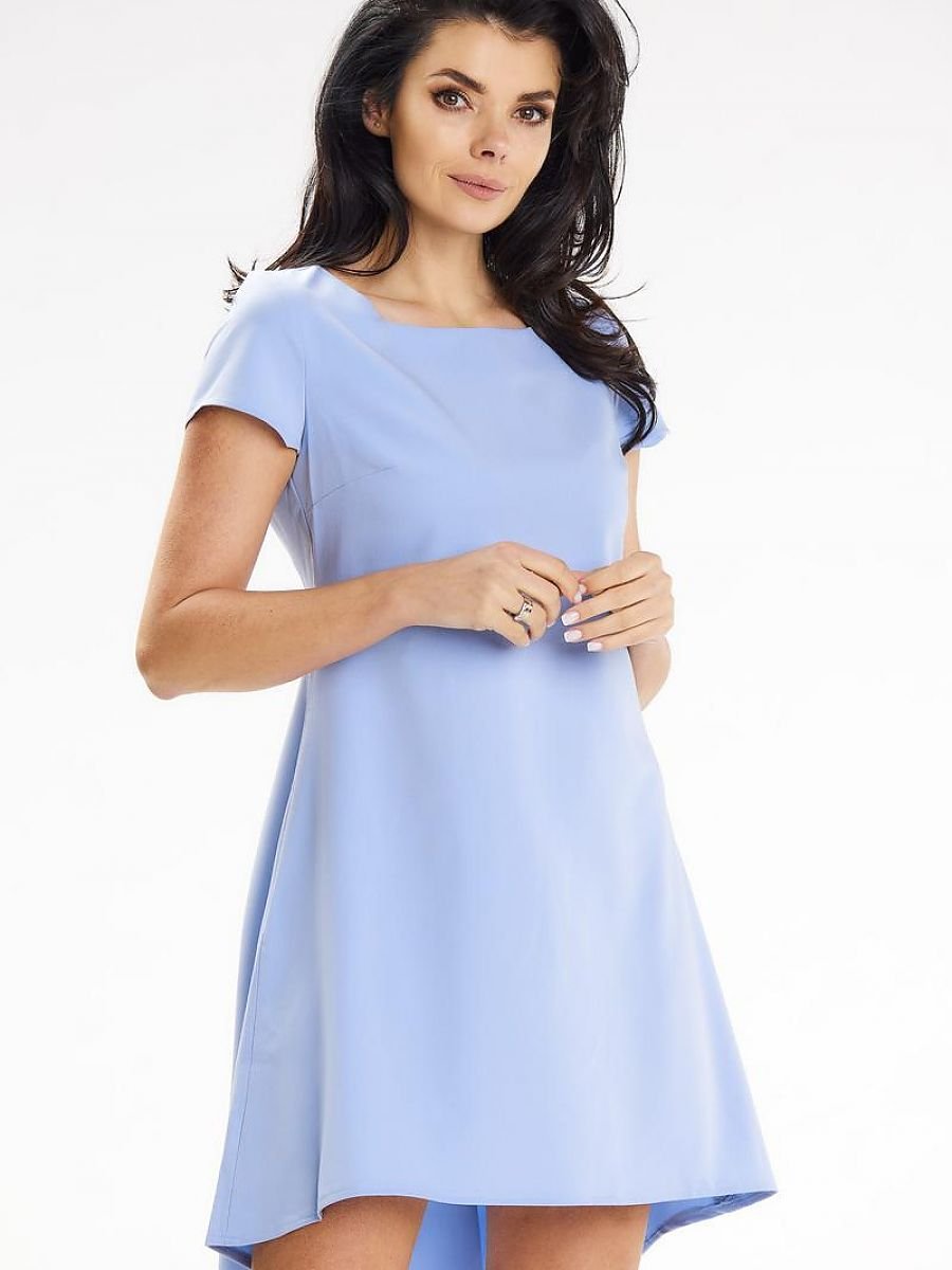 Asymetryczna sukienka mini, trapezowa, z krótkim rękawem i okrągłym dekoltem. Wyróżniają ją kontrafałdy ozdabiające tył produktu. Propozycja idealna na randkę oraz na imprezy rodzinne.