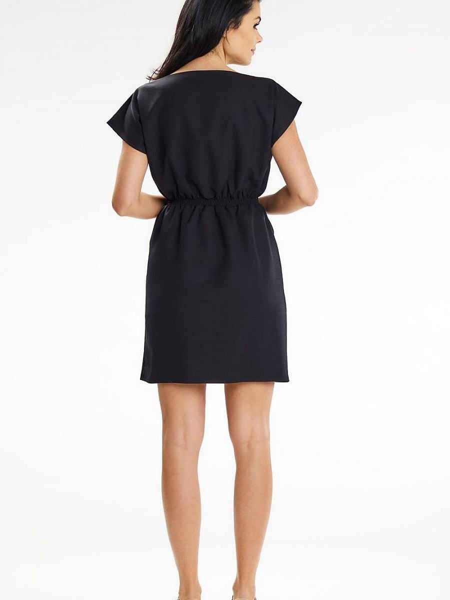 Prosta sukienka mini z gumką w pasie, dzięki czemu dopasowuje się do sylwetki. Posiada ona krótki rękaw oraz dekolt w łódkę. Dodatkowym atutem są kieszenie wsuwane. Jest to propozycja na ciepłe, letnie dni.