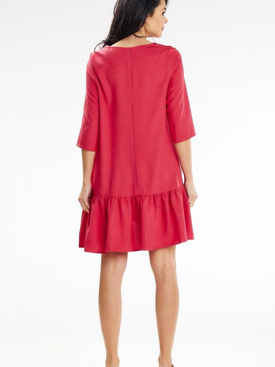 Luźna sukienka trapezowa o długości mini, z rękawami 3/4. Zapinana na zamek kryty. Zdobiona falbanką na dole, dodatkowo posiada kieszenie w szwie. Model ten sprawdzi się na letnie dni spędzone w gronie znajomych.