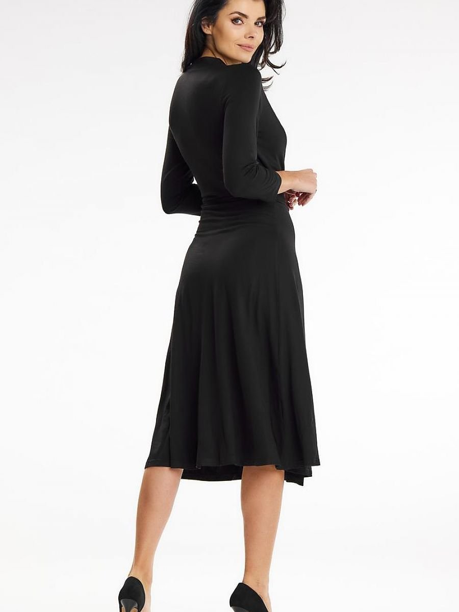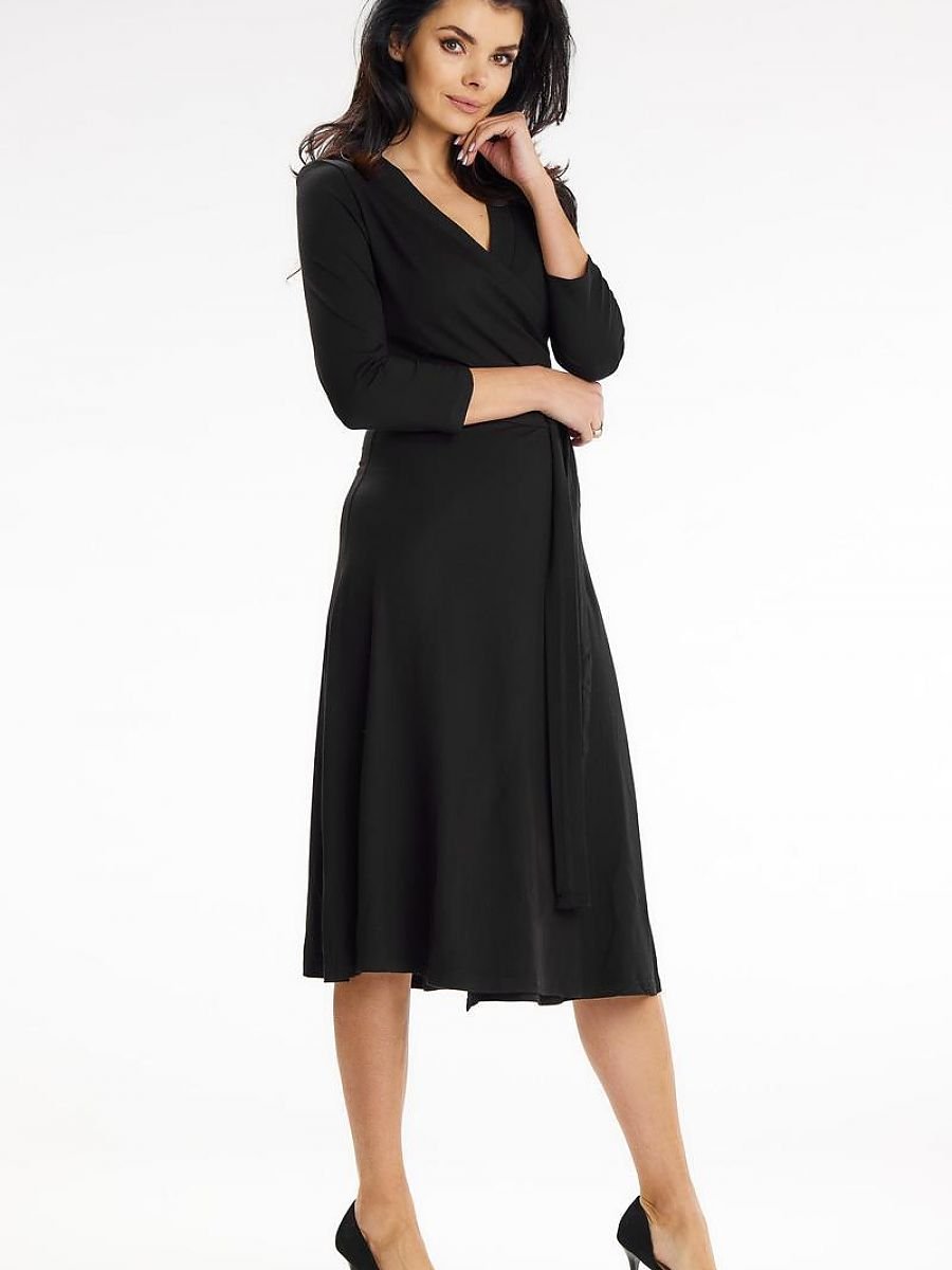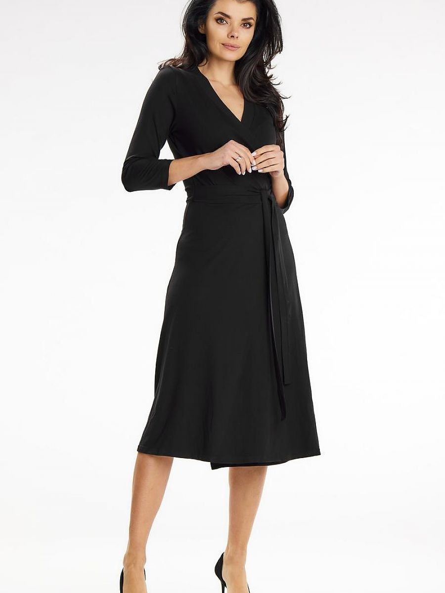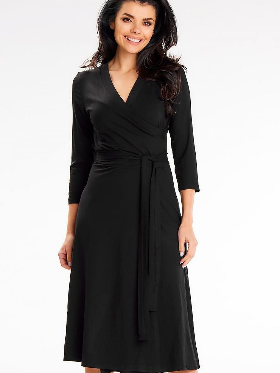Sukienka midi o kopertowej, dopasowanej górze i zakładanym dole. Model ten posiada pasek do przewiązania w talii oraz rękawek 3/4. Jest to propozycja na randkę ale również spotkanie rodzinne.