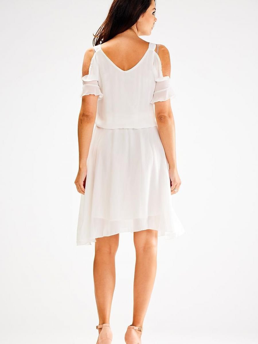 Przewiewna letnia sukienka. Uszyta jest z lekkiego szyfonu, dzięki czemu jest idealna na upalne dni. Rozcięcia na rękawach pięknie eksponują ramiona, a gumka w pasie sprawia że sukienka dopasowuje się do sylwetki. Dół sukienki na podszewce.