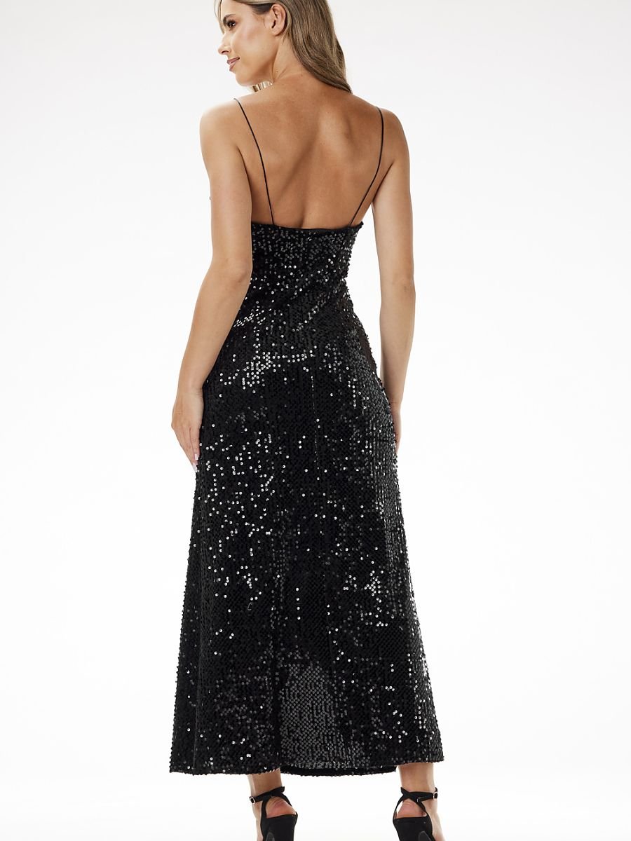 Wieczorowa sukienka maxi z cekinami Olśniewająca sukienka wieczorowa maxi z weluru z cekinami, idealna na wyjątkowe okazje. Dopasowany fason podkreśla sylwetkę, dodając elegancji i szyku. Dopasowany krój uwydatnia talię i biodra, dodając pewności siebie. Welur z cekinami pięknie błyszczy, tworząc efektowny look na wieczorne wyjścia. Delikatne ramiączka subtelnie eksponują ramiona, dodając zmysłowości. Zamek kryty zapewnia komfort zakładania i idealne dopasowanie. To idealna sukienka, która sprawi, że zabłyśniesz na każdej imprezie!