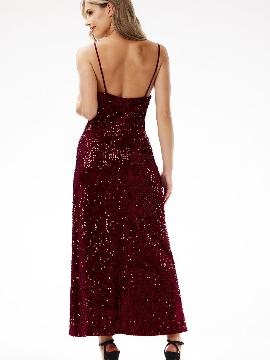 Wieczorowa sukienka maxi z cekinami Olśniewająca sukienka wieczorowa maxi z weluru z cekinami, idealna na wyjątkowe okazje. Dopasowany fason podkreśla sylwetkę, dodając elegancji i szyku. Dopasowany krój uwydatnia talię i biodra, dodając pewności siebie. Welur z cekinami pięknie błyszczy, tworząc efektowny look na wieczorne wyjścia. Delikatne ramiączka subtelnie eksponują ramiona, dodając zmysłowości. Zamek kryty zapewnia komfort zakładania i idealne dopasowanie. To idealna sukienka, która sprawi, że zabłyśniesz na każdej imprezie!