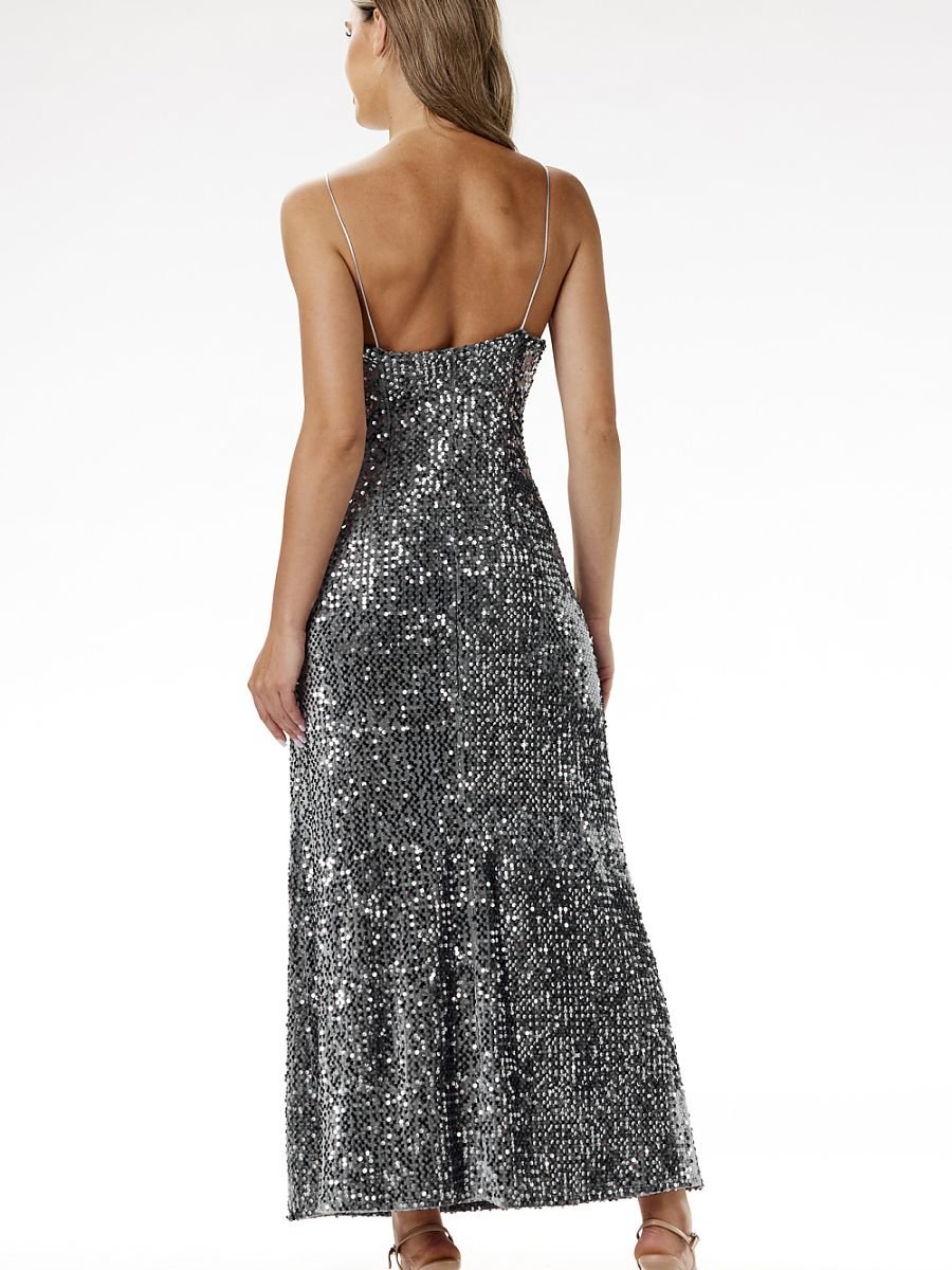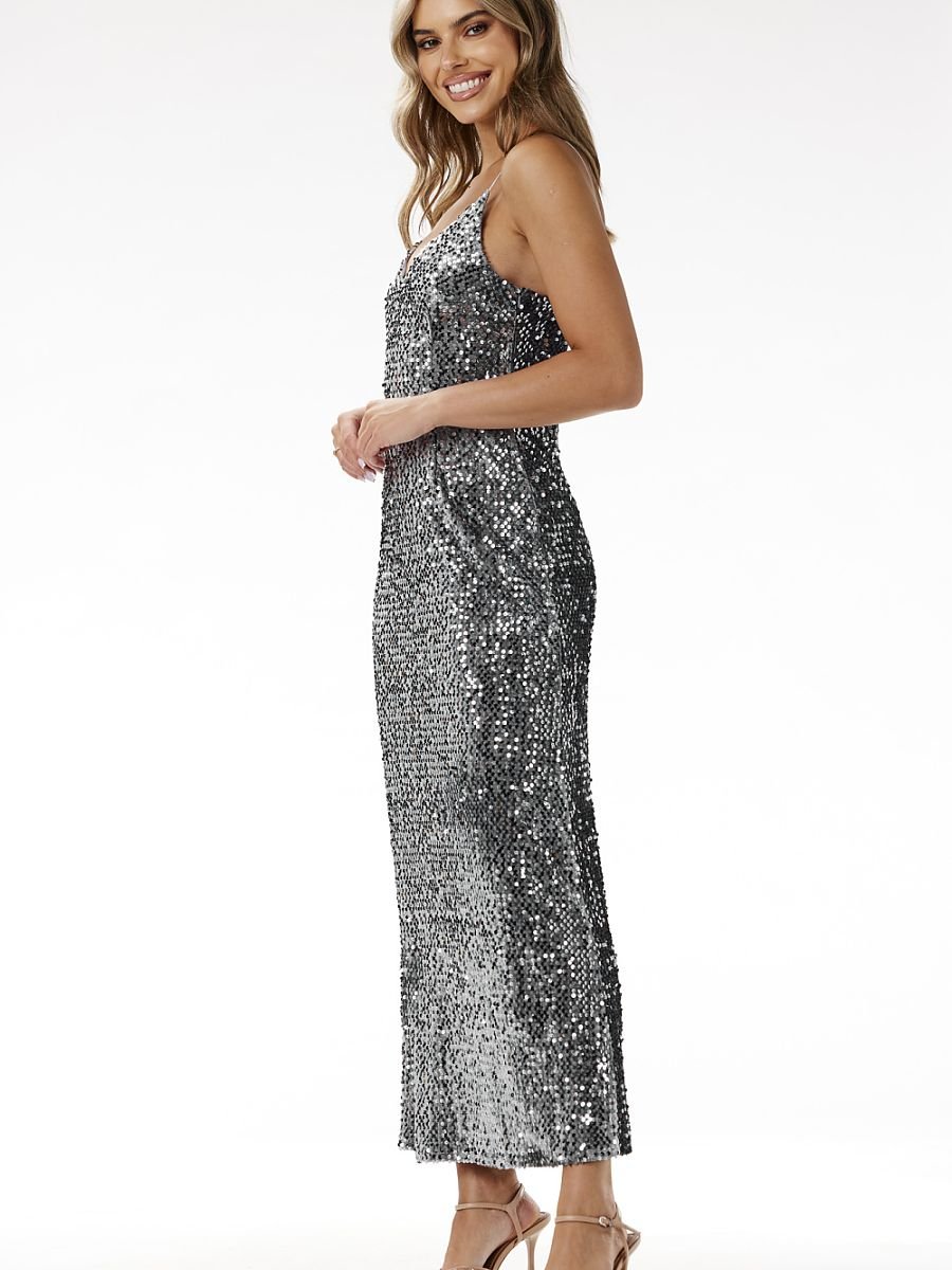 Wieczorowa sukienka maxi z cekinami Olśniewająca sukienka wieczorowa maxi z weluru z cekinami, idealna na wyjątkowe okazje. Dopasowany fason podkreśla sylwetkę, dodając elegancji i szyku. Dopasowany krój uwydatnia talię i biodra, dodając pewności siebie. Welur z cekinami pięknie błyszczy, tworząc efektowny look na wieczorne wyjścia. Delikatne ramiączka subtelnie eksponują ramiona, dodając zmysłowości. Zamek kryty zapewnia komfort zakładania i idealne dopasowanie. To idealna sukienka, która sprawi, że zabłyśniesz na każdej imprezie!
