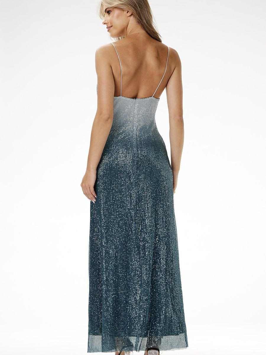 Wieczorowa sukienka cekinowa maxi na ramiączkach, efekt ombre. Elegancka sukienka maxi na ramiączkach z efektem ombre. Idealna na wyjątkowe okazje, jak sylwester, wesela czy eleganckie przyjęcia. Dopasowany krój podkreśla sylwetkę, a delikatny dekolt V dodaje klasy. Efekt ombre stopniowo przechodzący od bieli do czerni przyciąga wzrok i dodaje elegancji. Cienkie ramiączka oraz odkryte plecy podkreślają zmysłowość. Satynowa podszewka gwarantuje komfort noszenia i luksusowy wygląd, idealny na wyjątkowe wydarzenia.