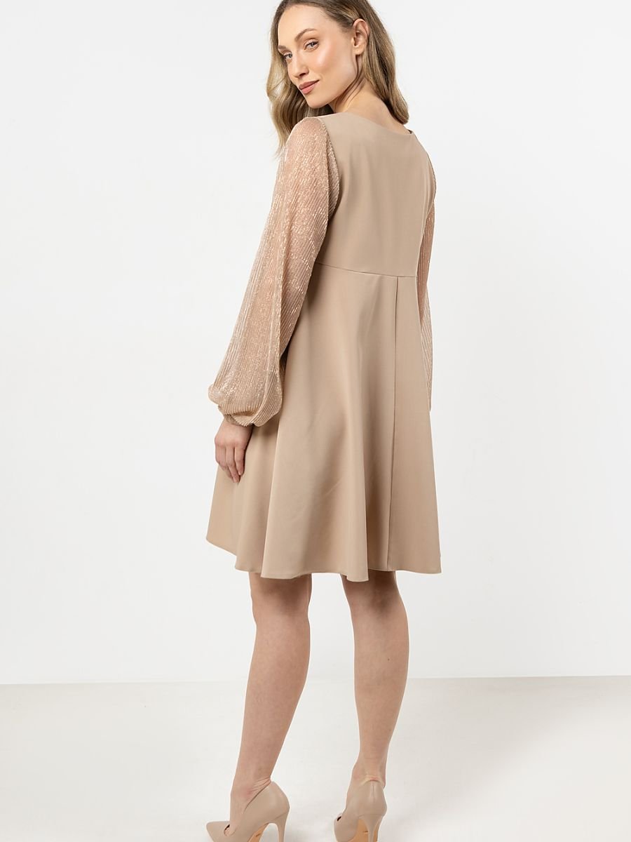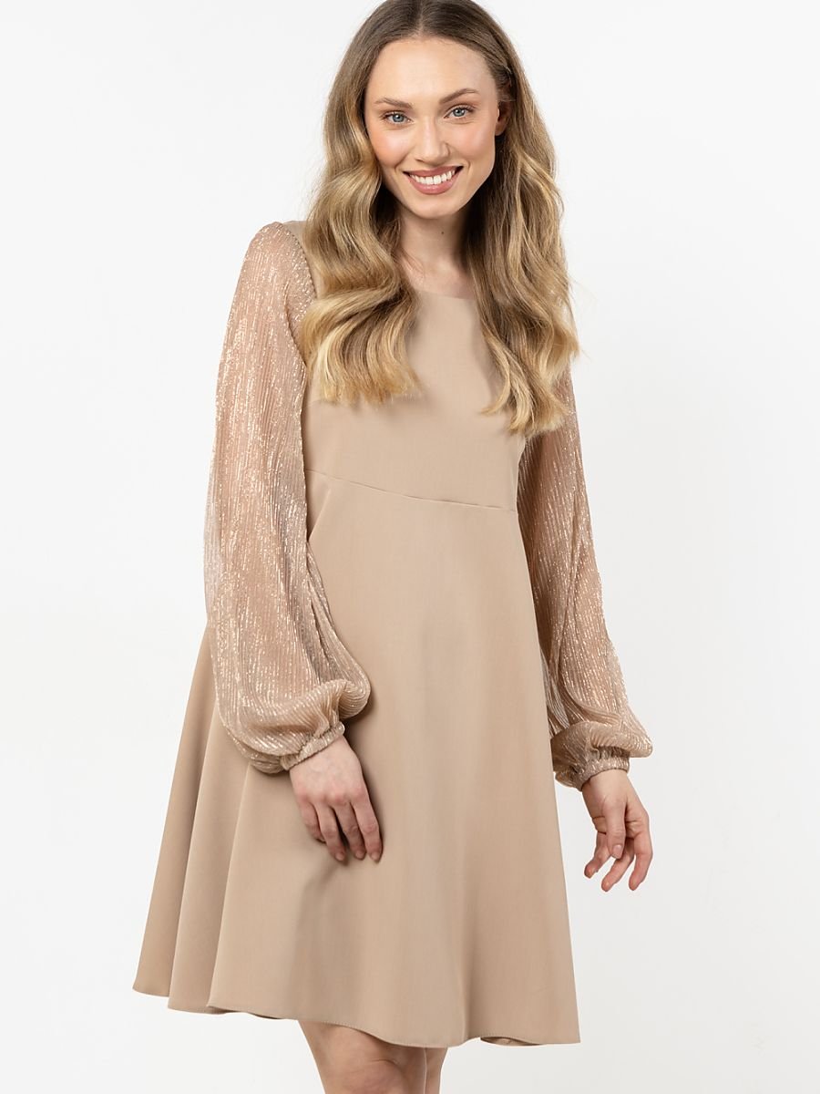 Ta sukienka to połączenie klasyki i luksusowego akcentu. Trapezowy krój zapewnia swobodę, a transparentne rękawy z tiulu z połyskiem dodają jej wyjątkowego charakteru. Kryty zamek gwarantuje idealne dopasowanie, podkreślając sylwetkę. Doskonała na eleganckie przyjęcia i uroczystości.