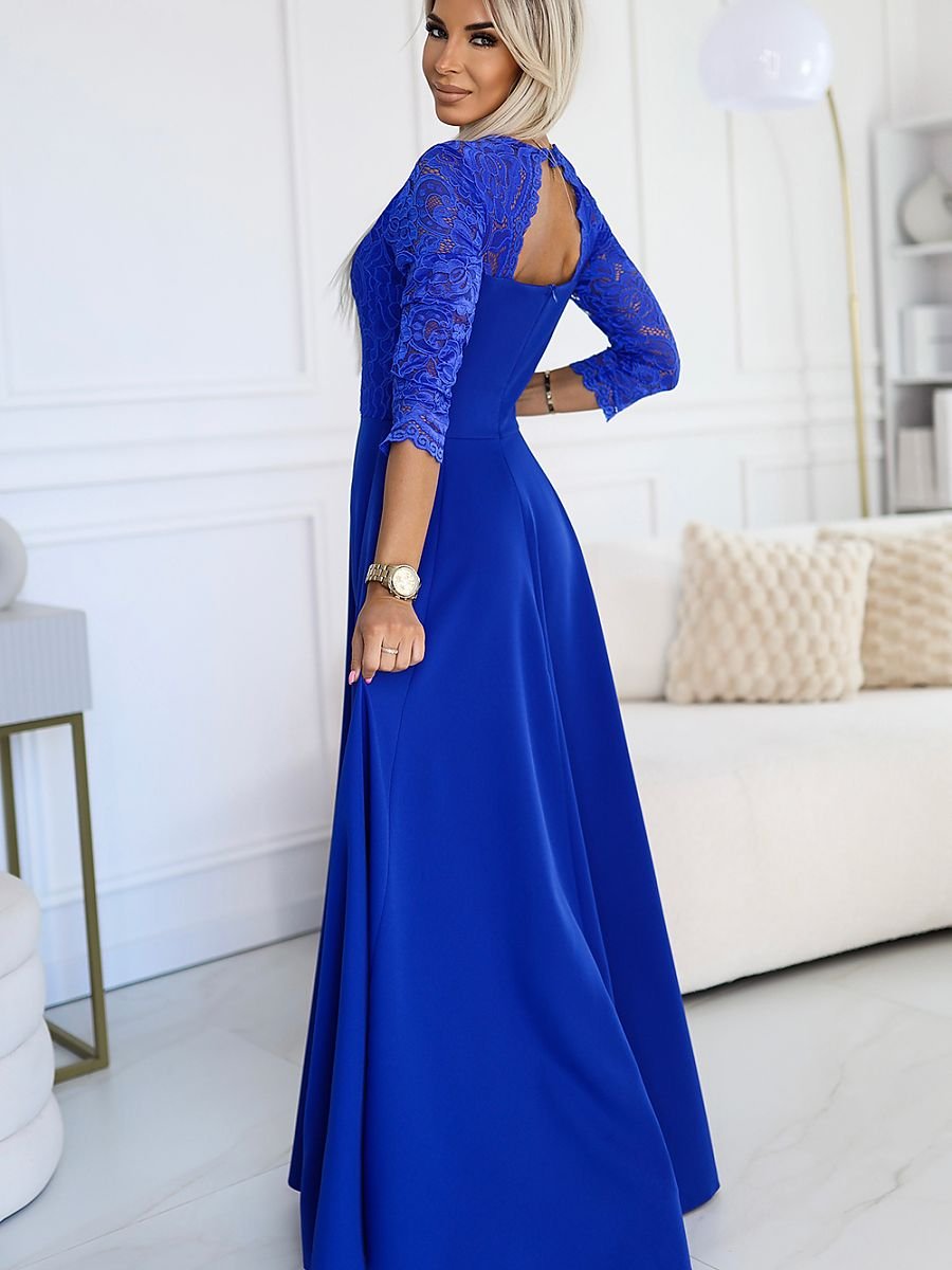 Amber to elegancka, długa koronkowa suknia maxi marki Numoco, która przyciąga wzrok wyjątkowym wyprofilowanym dekoltem i subtelnym rozcięciem na spódnicy. Uszyta w pięknym chabrowym odcieniu. Tworzy stylową i zmysłową kreację na wyjątkowe okazje. Produkt polski, który zachwyca jakością i dbałością o detale.