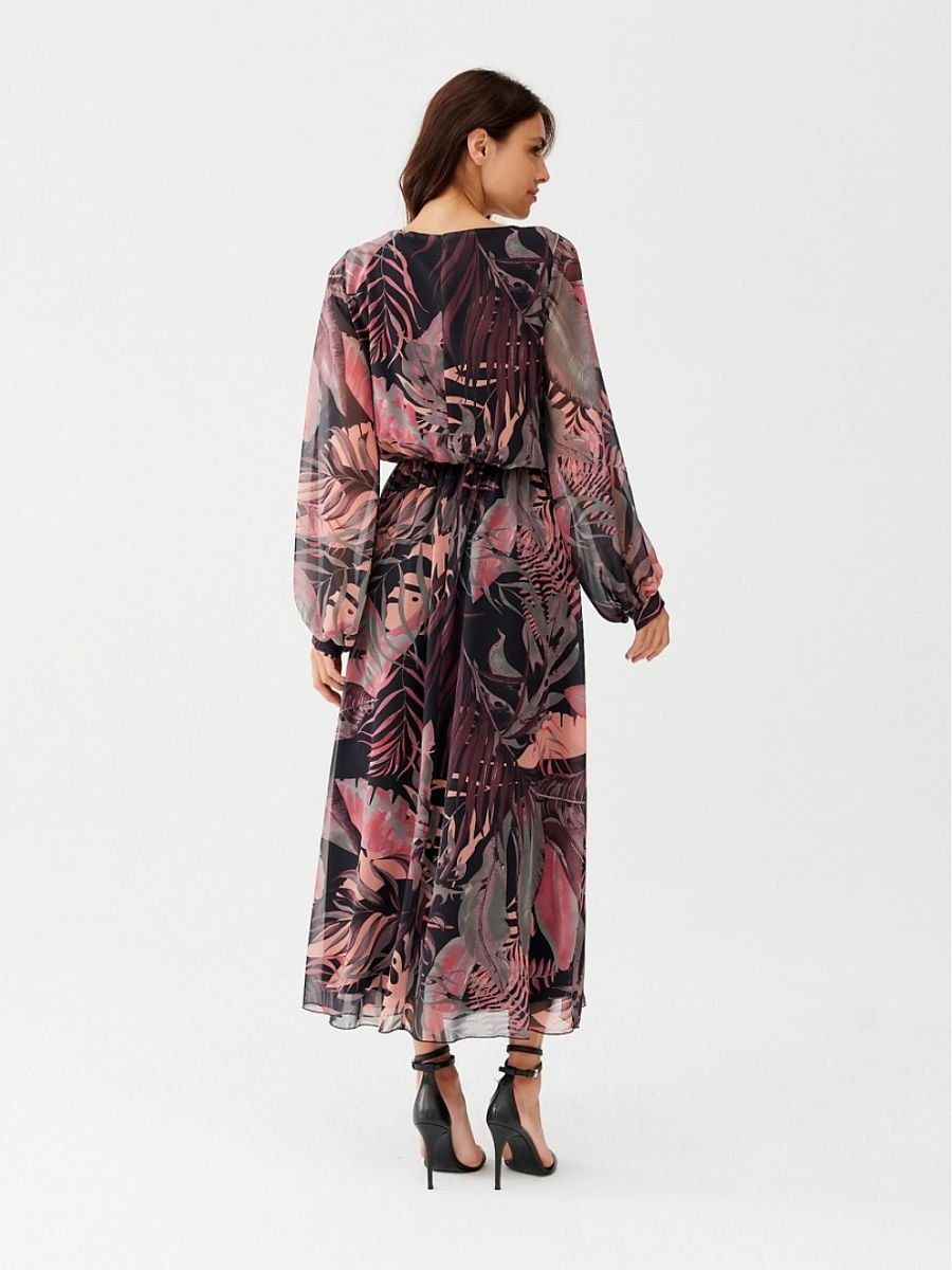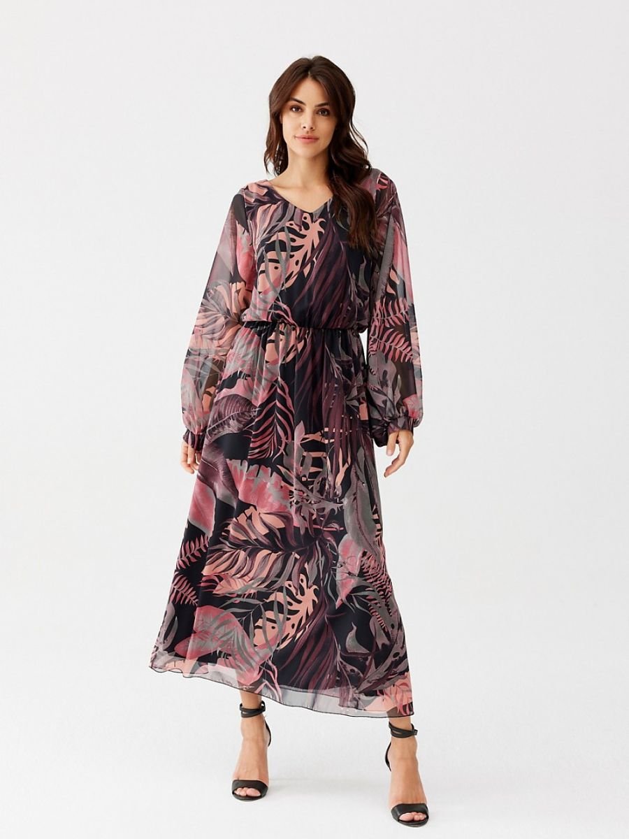 Ariela to długa sukienka wykonana z szyfonowego materiału, który pięknie układa się w ruchu. Ciekawe wzory dodają jej oryginalności i wyjątkowości. Sukienka posiada długie, półprzezroczyste rękawy, które tworzą bufiasty efekt. Dekolt w kształcie litery V pięknie podkreśla dekolt oraz szyję, a wszyta gumka w talii gwarantuje efekt klepsydry. Sukienka posiada podszewkę, która zapobiega prześwitywaniu. Sukienka Ariela to odpowiedni wybór na różne okazje. Z odpowiednimi dodatkami kreacja doskonale sprawdzi się na formalne oraz codzienne wyjścia. Długa, wzorzysta sukienka Ariela będzie się świetnie komponować z czarnymi, zamszowymi kozakami oraz niewielką torebką na ramię. Produkt jest wyprodukowany i uszyty w Polsce.