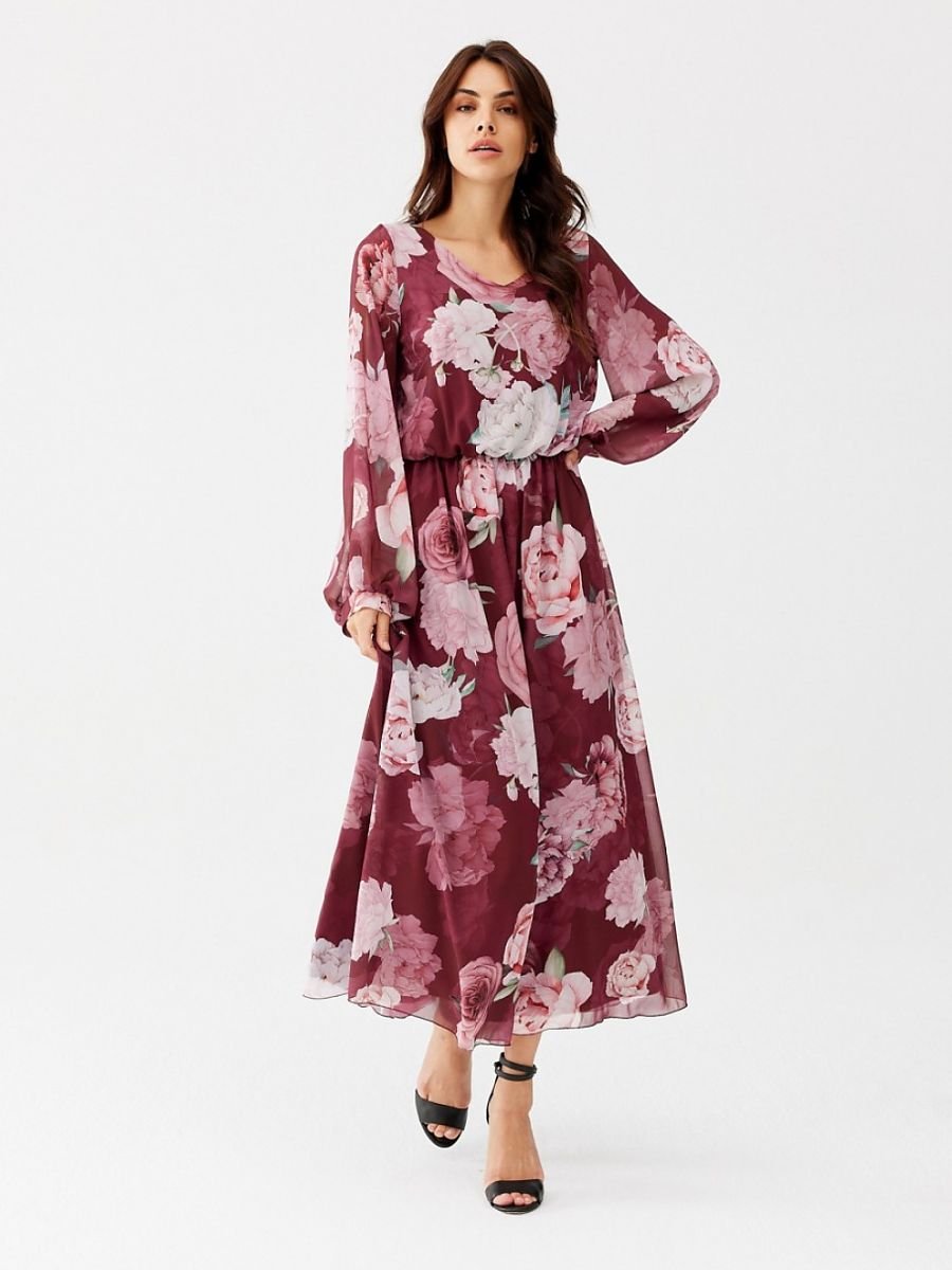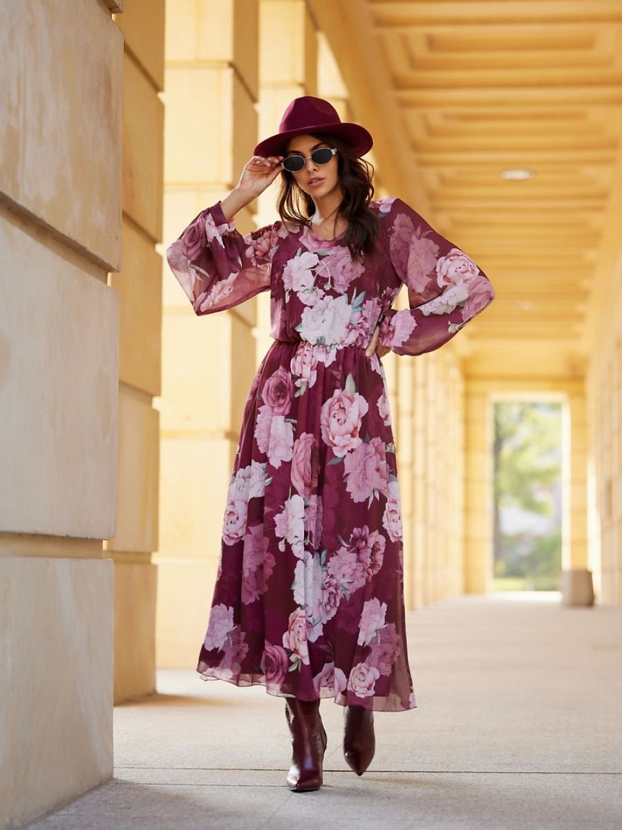 Ariela to długa sukienka wykonana z szyfonowego materiału, który pięknie układa się w ruchu. Ciekawe wzory dodają jej oryginalności i wyjątkowości. Sukienka posiada długie, półprzezroczyste rękawy, które tworzą bufiasty efekt. Dekolt w kształcie litery V pięknie podkreśla dekolt oraz szyję, a wszyta gumka w talii gwarantuje efekt klepsydry. Sukienka posiada podszewkę, która zapobiega prześwitywaniu. Sukienka Ariela to odpowiedni wybór na różne okazje. Z odpowiednimi dodatkami kreacja doskonale sprawdzi się na formalne oraz codzienne wyjścia. Długa, wzorzysta sukienka Ariela będzie się świetnie komponować z czarnymi, zamszowymi kozakami oraz niewielką torebką na ramię. Produkt jest wyprodukowany i uszyty w Polsce.