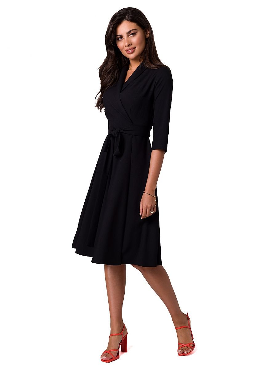 Niezwykle kobieca sukienka o kopertowym kroju, z rozkloszowanym dołem i kołnierzem szalowym, przewiązana w talii paskiem.