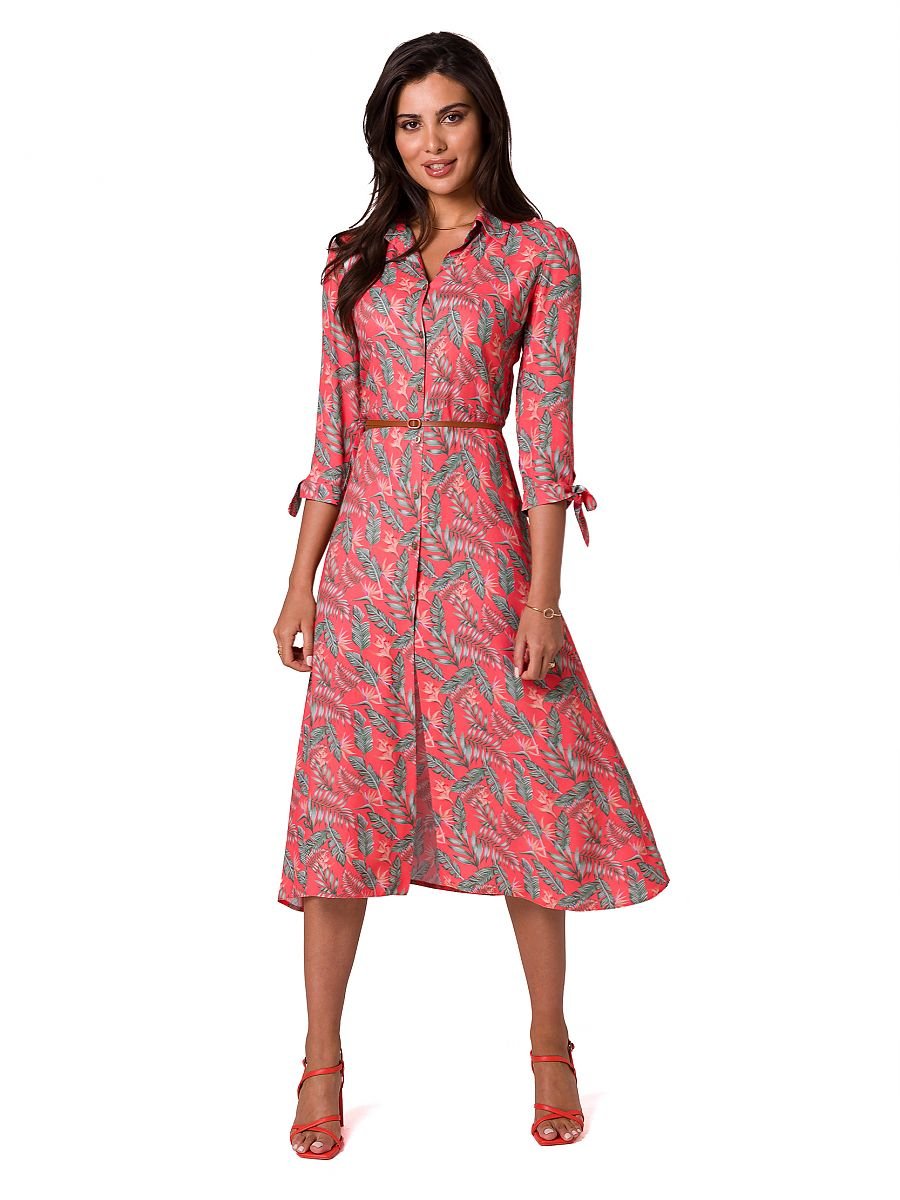 Sukienka o fasonie litry A, z kołnierzykiem, rozpinana na przodzie i przewiązana paskiem z klamerką, kwintesencja kobiecości.