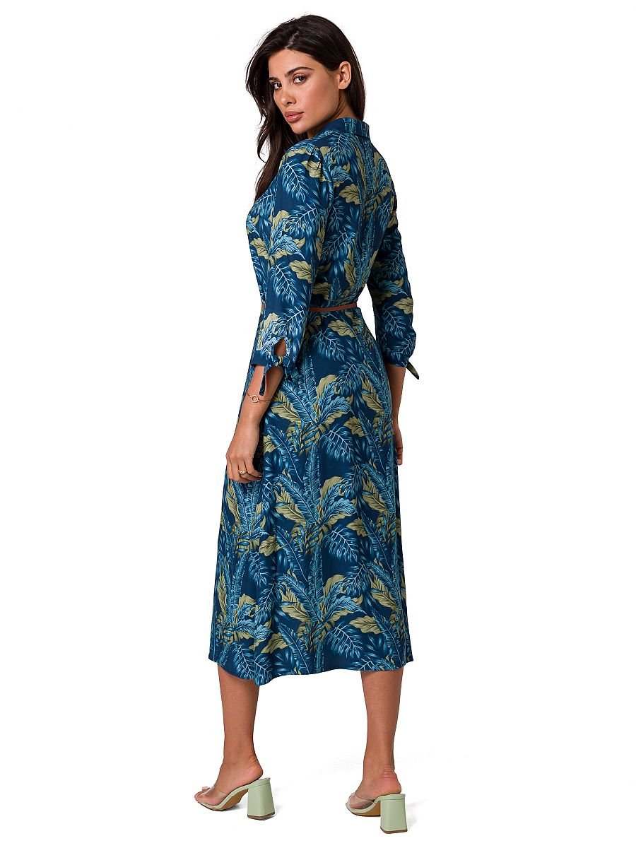 Sukienka o fasonie litry A, z kołnierzykiem, rozpinana na przodzie i przewiązana paskiem z klamerką, kwintesencja kobiecości.