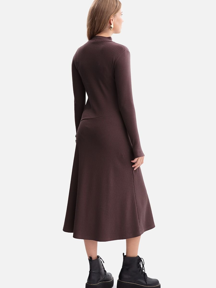 Sukienka wykonana z wysokiej jakości prążkowanej dzianiny o gramaturze 250 g, która pięknie układa się na sylwetce i zapewnia komfort noszenia. Model wkładany przez głowę, bez kieszeni i podszewki, utrzymany w nowoczesnym, kobiecym stylu. Stójka pod szyję nadaje elegancji i subtelnie wydłuża szyję, a długie, dopasowane rękawy z wycięciem na kciuk podkreślają smukłość ramion i nadają całości sportowego charakteru. Fason łączy dopasowaną górę z odcięciem na linii bioder i lekko rozkloszowanym dołem, co pięknie modeluje sylwetkę, podkreśla talię i dodaje lekkości w ruchu. Długość midi, do połowy łydki, sprawia, że sukienka jest jednocześnie kobieca, elegancka i praktyczna. Zaprojektowana i uszyta w Polsce z dzianiny wyprodukowanej w Łodzi, to połączenie jakości, wygody i ponadczasowego stylu.