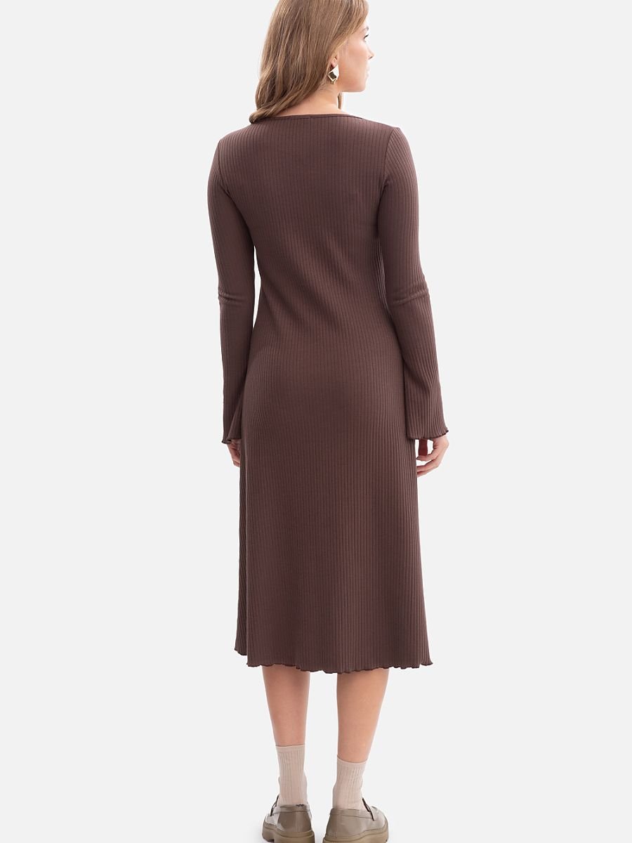 Sukienka wykonana z miękkiej, prążkowanej dzianiny o gramaturze 250 g, która zapewnia wygodę i naturalne dopasowanie do sylwetki. Model wkładany przez głowę, bez kieszeni i podszewki, utrzymany w lekkiej i kobiecej formie. Klasyczny, okrągły dekolt z subtelnym wycięciem podkreśla szyję, a długie rękawy lekko rozszerzane przy mankietach dodają całości delikatnej elegancji. Zdobienia w postaci falowanego dołu i wykończenia rękawów wprowadzają nutę romantycznej lekkości. Fason łączy dopasowaną górę z lekko rozkloszowanym dołem, co pięknie modeluje sylwetkę i zapewnia swobodę ruchów. Długość midi, sięgająca do połowy łydki, nadaje sukience uniwersalny, ponadczasowy charakter. Zaprojektowana i uszyta w Polsce z dzianiny wyprodukowanej w Łodzi, to połączenie jakości, kobiecej elegancji i lokalnego rzemiosła.