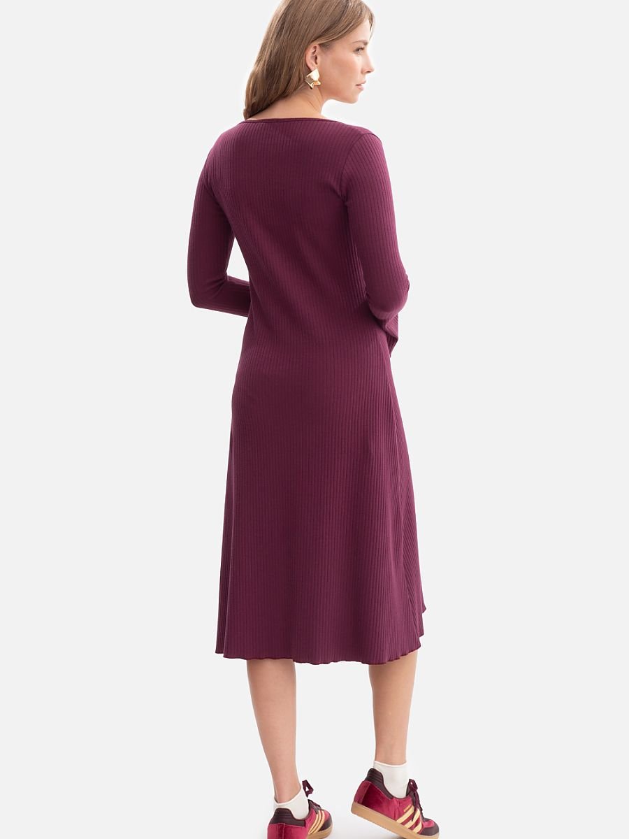 Sukienka wykonana z miękkiej, prążkowanej dzianiny o gramaturze 250 g, która zapewnia wygodę i naturalne dopasowanie do sylwetki. Model wkładany przez głowę, bez kieszeni i podszewki, utrzymany w lekkiej i kobiecej formie. Klasyczny, okrągły dekolt z subtelnym wycięciem podkreśla szyję, a długie rękawy lekko rozszerzane przy mankietach dodają całości delikatnej elegancji. Zdobienia w postaci falowanego dołu i wykończenia rękawów wprowadzają nutę romantycznej lekkości. Fason łączy dopasowaną górę z lekko rozkloszowanym dołem, co pięknie modeluje sylwetkę i zapewnia swobodę ruchów. Długość midi, sięgająca do połowy łydki, nadaje sukience uniwersalny, ponadczasowy charakter. Zaprojektowana i uszyta w Polsce z dzianiny wyprodukowanej w Łodzi, to połączenie jakości, kobiecej elegancji i lokalnego rzemiosła.