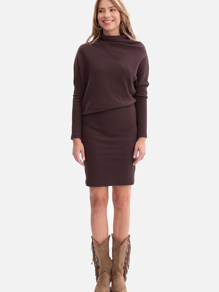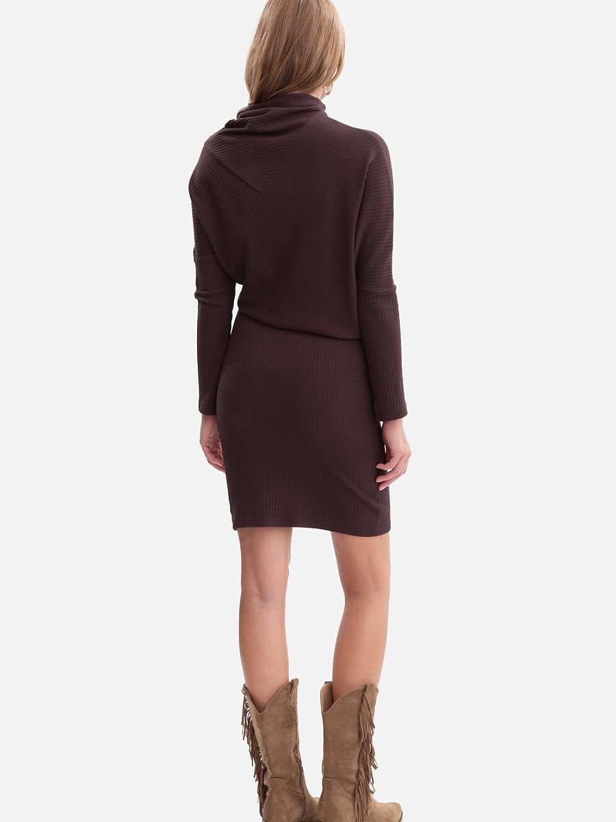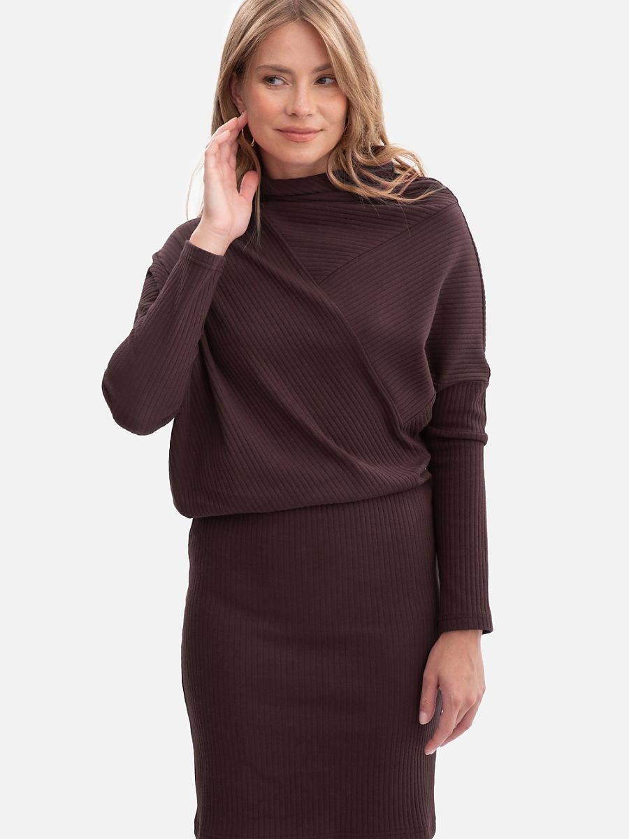 Sukienka uszyta z wysokiej jakości prążkowanej dzianiny o gramaturze 250 g, która pięknie układa się na sylwetce i zapewnia komfort noszenia. Model wkładany przez głowę, bez kieszeni i podszewki, dzięki czemu pozostaje lekki i wygodny. Wyjątkowego charakteru nadaje jej wysoka stójka z miękkim wyłożeniem, subtelnie otulająca szyję. Długie, nietoperzowe rękawy zwężane ku dołowi tworzą efektowną linię ramion, a luźniejsza góra w połączeniu z dopasowanym, ołówkowym dołem nadaje sukience bluzowany fason, który podkreśla talię i wysmukla sylwetkę. Długość mini, sięgająca przed kolano, sprawia, że sukienka idealnie łączy elegancję z kobiecą lekkością. Zaprojektowana i uszyta w Polsce z dzianiny wyprodukowanej w Łodzi, to propozycja dla kobiet ceniących lokalne rzemiosło, wysoką jakość i ponadczasowy styl.