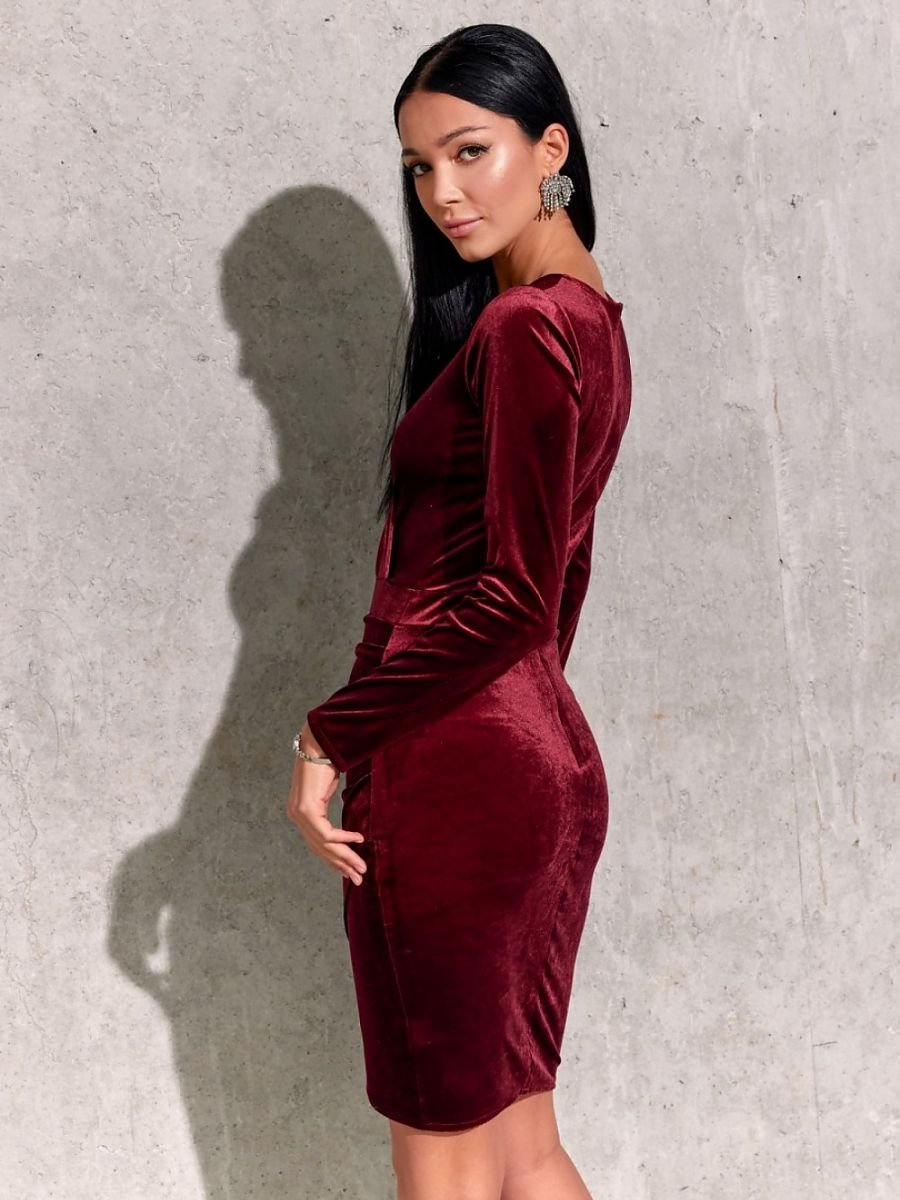 Elegancka sukienka z przekładanym dekoltem i dołem sukienki tworząc delikatnie asymetryczny krój. Sukienka ma kopertowy dekolt podkreślający biust. Dół sukienki jest na zakładkę, dzięki czemu zjawiskowo eksponuje i wydłuża nogi. Dopasowana sukienka o długości przed kolano, podkreślająca kobiece wdzięki. Marszczenia pięknie podkreślają talię i ukrywają ewentualne niedoskonałości. Dzięki swojej uniwersalności sukienka jest idealna zarówno na co dzień jak i różne okoliczności. Welurową sukienkę, niezależnie od wybranego koloru, możesz wystylizować na elegancko, dodając do niej wysokie obcasy, torebkę kopertówkę i ulubioną biżuterię. Natomiast w stylizacji na co dzień, możesz dopasować zamszowe kozaki, torbę w stonowanych kolorach i kapelusz, całość stworzy niesamowity look z pazurem. Krój sukienki bardzo ładnie dopasuje się do sylwetki niezależnie od rozmiaru i będzie współgrał z naszymi ruchami. Zapinana z tyłu na kryty zamek. Ten model to zdecydowany must-have sezonu jesienno-zimowego. Produkt jest wyprodukowany i uszyty w Polsce.