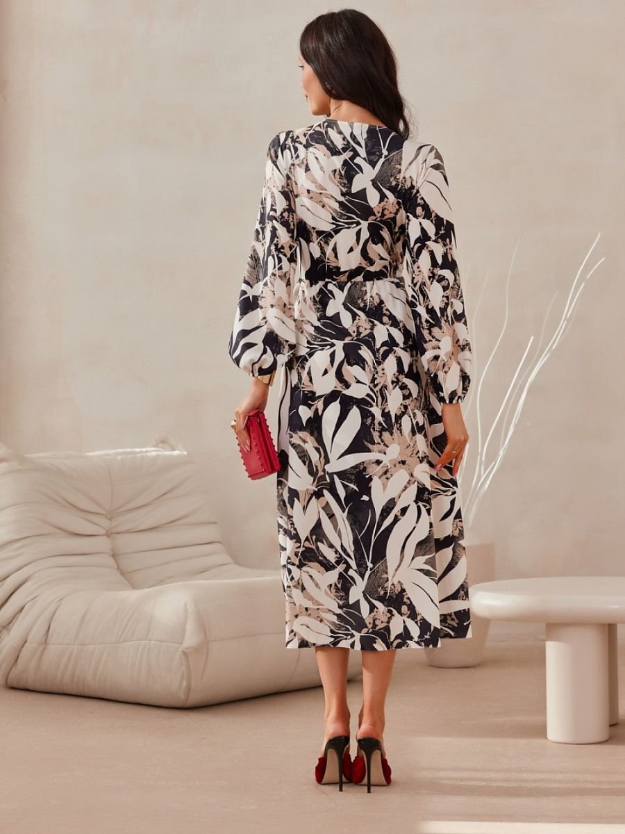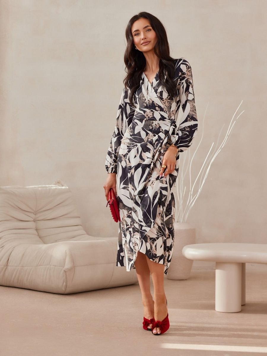 Sukienka midi z długimi rękawami. Góra kopertowa, a dół delikatnie rozkloszowany. Nie posiada podszewki, w pasie podwójne wiązanie.