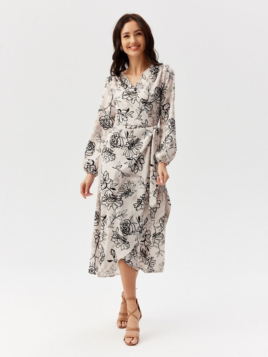 Sukienka midi z długimi rękawami. Góra kopertowa, a dół delikatnie rozkloszowany. Nie posiada podszewki, w pasie podwójne wiązanie.