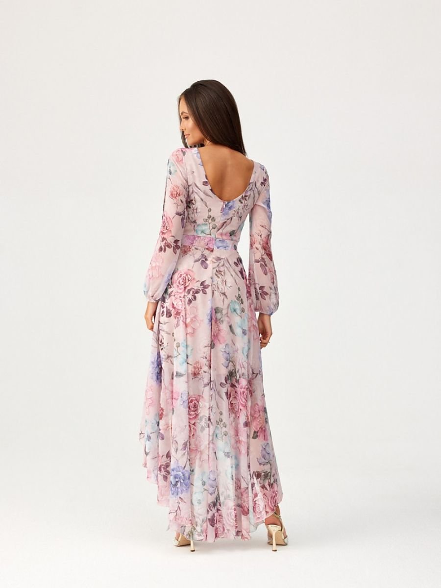 Asymetryczna suknia w maxi długości. Rozkloszowany dół, góra z przekładanym dekoltem oraz niesamowite długie bufiaste rękawy z ozdobnymi rozcięciami. Rękawy zakończone elastyczną gumką. Sukienka zwężana przy pasie, znakomicie podkreśli okolice talii. Zapinana z tyłu na zamek błyskawiczny z delikatną ekspozycją pleców. Sukienka posiada wszytą halkę, dzięki czemu materiał nie będzie prześwitywał. Wystarczy delikatna biżuteria, a zachwycisz wszystkich dookoła. Krój i długość będą idealne dla każdej figury, nadadzą sylwetce lekkości i dodadzą optycznie kilku centymetrów długości. Zwiewny i delikatny materiał będzie delikatnie falował z każdym Twoim ruchem, pozostawiając po sobie niezapomniane wrażenie. Produkt jest wyprodukowany i uszyty w Polsce.