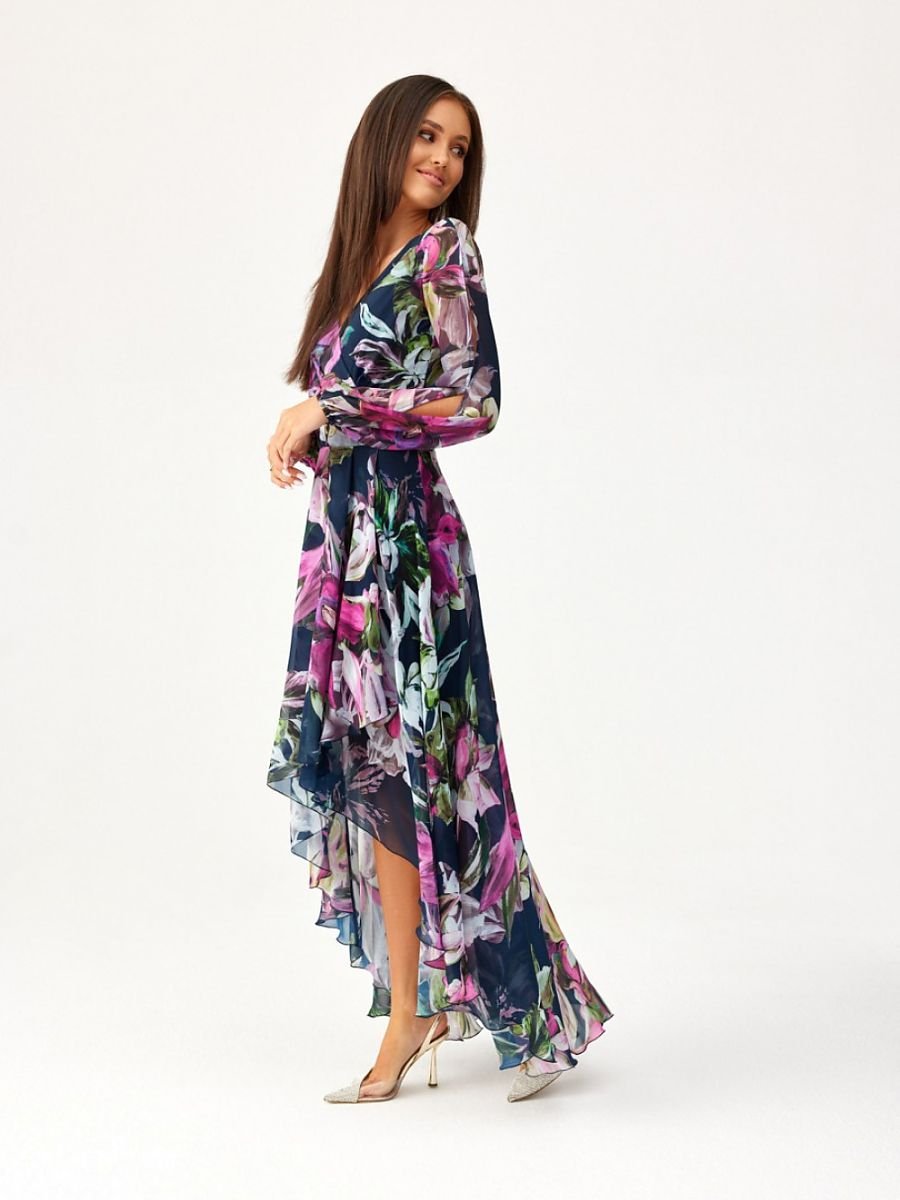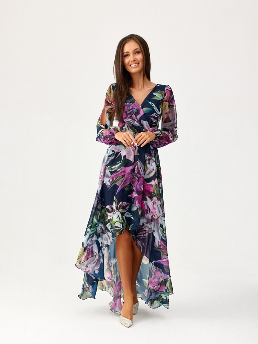 Asymetryczna suknia w maxi długości. Rozkloszowany dół, góra z przekładanym dekoltem oraz niesamowite długie bufiaste rękawy z ozdobnymi rozcięciami. Rękawy zakończone elastyczną gumką. Sukienka zwężana przy pasie, znakomicie podkreśli okolice talii. Zapinana z tyłu na zamek błyskawiczny z delikatną ekspozycją pleców. Sukienka posiada wszytą halkę, dzięki czemu materiał nie będzie prześwitywał. Wystarczy delikatna biżuteria, a zachwycisz wszystkich dookoła. Krój i długość będą idealne dla każdej figury, nadadzą sylwetce lekkości i dodadzą optycznie kilku centymetrów długości. Zwiewny i delikatny materiał będzie delikatnie falował z każdym Twoim ruchem, pozostawiając po sobie niezapomniane wrażenie. Produkt jest wyprodukowany i uszyty w Polsce.